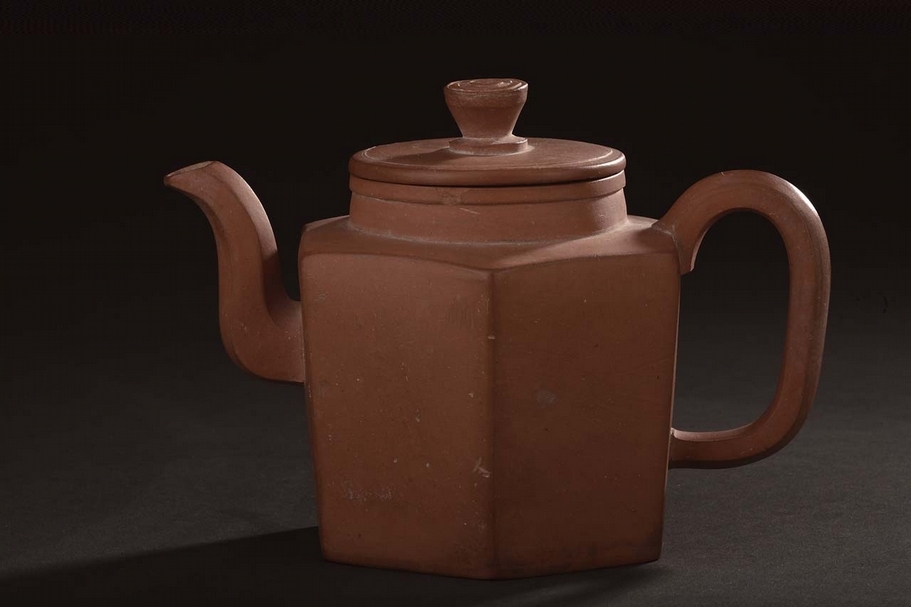 圖11 明〈大彬款六方紫砂壺〉。通高11公分。1968年江都縣丁溝鄉洪飛村鄭王莊明墓出土。壺圓形蓋,子口與壺口套合,蓋頂圓鈕,鈕上印對合半弧紋,壺身六方形,直口,斜折肩,六稜形曲流,五角形彎執。底內凹,紫砂泥質細潤,色呈赭紅,上有銀砂閃點。底部正中刻「大彬」直行楷書款。至今人稱「神品」的時大彬紫砂壺,在揚州一個村莊的墓葬中出土,跨越這麼久的時空,我們無法知其前世的歷程,卻可以從其樸素無華、簡潔大方的型體中,去感知那個時代的風尚。(揚州博物館提供)