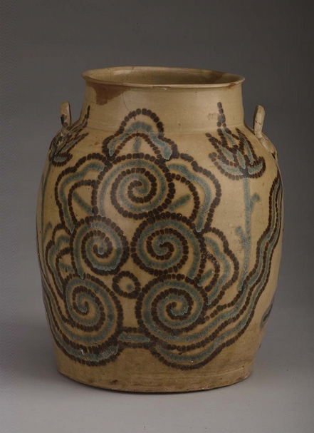 圖8 唐〈青釉褐綠點彩雲紋雙耳罐〉,高29.8公分、口徑16.3公分、底徑19.5公分。1974年揚州市唐城遺址出土。罐直口、卷唇、高頸,略鼓腹、平底。肩部置對稱扁環形雙繫,繫上飾「王」字。器身布滿紋飾,褐、綠兩色相間,以點彩聯珠手法,形成卷雲圖案和蓮葉蓮花紋飾。其藝術構思和創作令人稱奇。此罐胎體為米黃色,通體施青黃釉。其形體之大、紋飾之奇、釉色之美,是長沙窯罕見之精品。(揚州博物館提供)