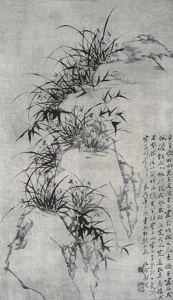 圖12 清代鄭燮〈蘭竹石圖軸〉,縱178公分、橫102公分,筆墨紙本。鄭燮(1693~1765)字克柔,號板橋,江蘇興化人。乾隆元年(1736)進士。官山東范縣、濰坊知縣,有政聲。做官前後均居揚州,以書畫營生。鄭燮曾說「蘭花本是山中草,還向山中種此花」。他筆下的蘭花均生在石頭之間,使其回歸天性,順應自然。此畫以石為脈,把一叢叢分散的蘭竹有機的統貫一氣,疏密得當,既嚴整而又有變化。濃墨繪蘭竹、淡筆勾山石,有清高拔俗、自然天成的趣味。此幅為板橋蘭竹精品。乾隆十三年(1748)春,乾隆帝東巡,正在濰縣做知縣的鄭板橋奉命擔任書畫史,臥泰山頂40餘日,常以此自豪,所以刻了「乾隆東封書畫史」一印。此畫當是板橋56歲之後所作。題識:「平生愛所南先生及陳古白畫蘭竹,既又見大滌子畫石,或依法皴,或不依法皴;或整或碎,或完或不完。遂取其意構成石勢,然後以蘭竹彌縫其間,雖學之兩家而筆墨則一氣也。宏翁同學老長兄善品題書畫,故就正焉。板橋鄭燮。」鈐印:「乾隆東封書畫史」(白文)、「歌吹古揚州」(朱文)。(揚州博物館提供)