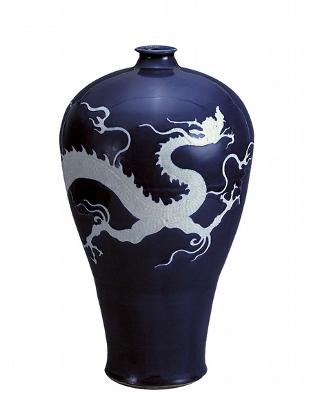 圖10 元〈霽藍釉白龍紋梅瓶〉,高43.5公分、口徑5.5公分、底徑14公分。1984年從揚州市文物商店轉入。梅瓶口小,頸短,肩豐,肩以下逐漸收斂,至近底部微微外撇。淺底內凹。通體施霽藍釉,雲龍、寶珠施青白釉,兩種釉色對比鮮明、強烈。主紋刻劃一龍追趕火焰寶珠,巨龍威武、雄壯、悍猛,騰空飛舞於萬里藍天之中,又似遨遊於無際的大海之中。此瓶器形碩大,造型秀挺,釉色淨潤,紋飾精美且又生動活潑,氣勢磅礡,集科技、歷史、藝術之大美,是梅瓶中極品。(揚州博物館提供)