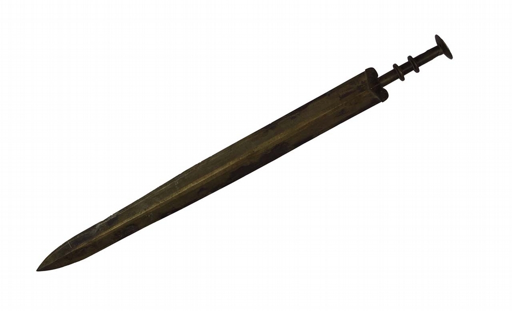 圖4 戰國〈銅劍〉,長59公分、寬5公分、莖長9.5公分。為揚州博物館舊藏。瘦長的劍身,挺直的劍脊,鋒利的劍刃,跨越千年仍殺氣逼人,是越王勾踐劍還是吳王夫差的士兵們手中的劍,已然不重要了,重要的是,這把劍代表了那個時代血與火的征服與掠奪。(揚州博物館提供)