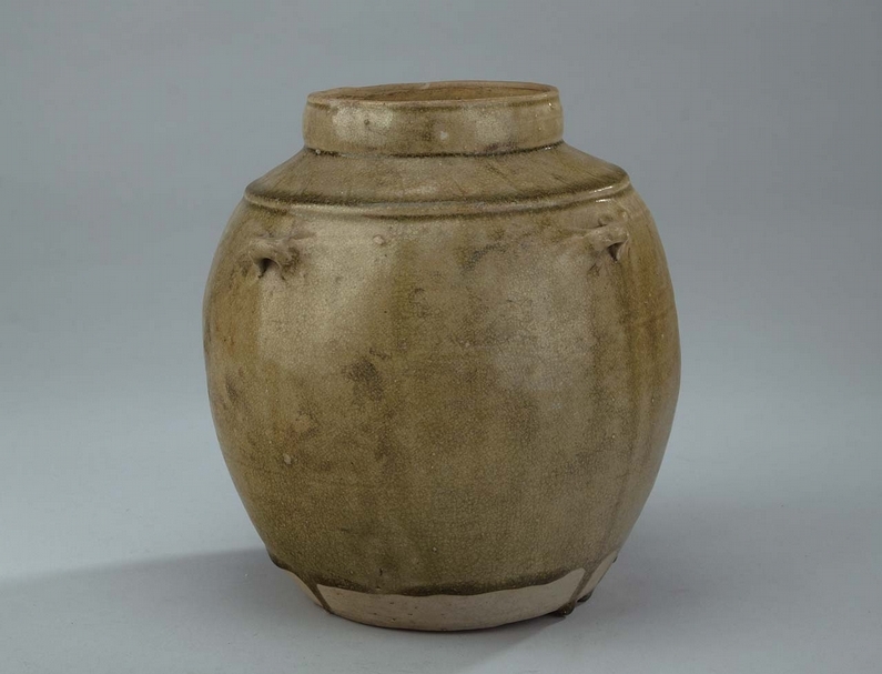圖6 東漢〈青瓷四繫罐〉,高22.5公分、口徑10.8公分、腹徑21公分、底徑12.9公分,1980年出土於揚州市邗江縣甘泉鄉香巷村東漢磚室墓中。此罐直口,圓唇內斂、短頸、弧肩微突、鼓腹、平底內凹,肩部有一道圓脊,四個對稱的泥條狀橫繫。灰白胎上印細麻布紋,施青黃釉露底部並有流釉,釉面有細開片。先民在商代就開始燒造瓷器,直至東漢才燒造成完全意義上的青瓷器。此罐造型端莊敦實、釉色肥潤雅致、釉面開片均細自然,是越窯早期青瓷器的代表作。(揚州博物館提供)