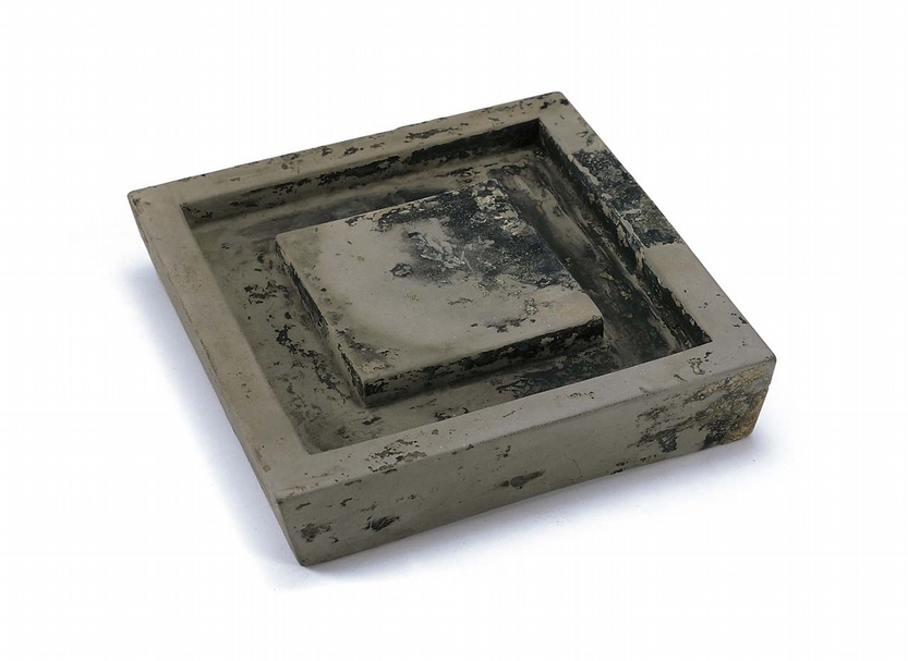 圖9-1 北宋〈「仲舉澄泥」銘硯〉,高3.2公分、硯面17×16.8公分、底16×15.6公分。1998年揚州市郊城北三星村宋墓出土。硯澄泥質,極細膩。近正方倒梯形,中心設邊長8.5公分的硯面,殘留墨蹟,邊圍回形硯池。底微內凹,中鈐「仲舉澄泥」方形陰文印,是宋代澄泥硯的精品。硯上的一點殘墨,不知能否見證「重文輕武」的時代特徵,還有揚州「文章太守」的筆墨情懷;但四大名硯之「澄泥」卻伴隨了我們千年,點點滴滴傳承著中華文脈。(揚州博物館提供)