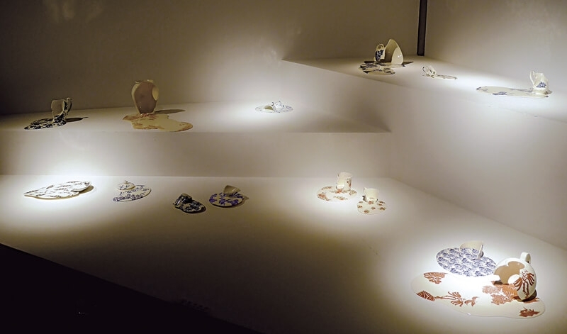 最後,青花不再只是青花,青花成了種意象,擁有獨特的視覺語言及文化脈絡,藝術家透過動畫、影像甚至是文學文本,來讓青花意象有嶄新的詮釋方式。「跨域」單元中,英國藝術家安德魯.立文史東(Andrew Livingstone)利用工業用瓷盤及數位動畫等呈現的〈解構貿易〉,表現上解構了青花瓷「柳葉紋樣」中的小橋流水,成了工廠吊車,背後的核心問題是對於陶瓷產業的衰退及後續所造成的城市變化,「柳葉紋樣」所代表的正宗,最終受到不可避免的挑戰。