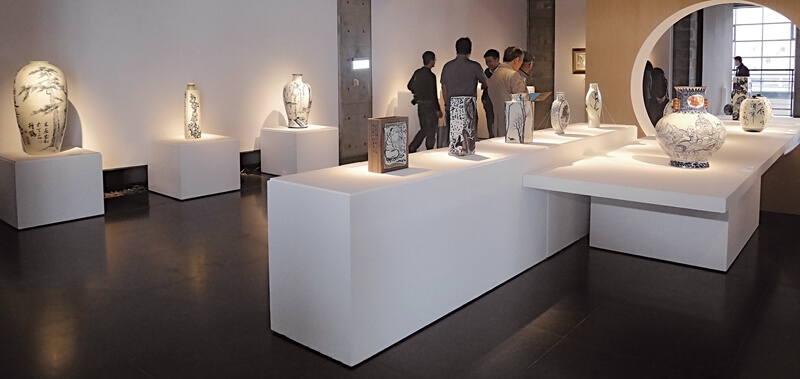 時間再往後推移,藝術家的加入讓青花瓷的樣貌有了新的氣象,陶藝家對於陶瓷的塑形與藝術家的青花書畫完美結合,形成個人特色的同時,連帶產生對於傳統工藝審美價值的挑戰,也使觀眾能夠在傳承與新氣象間看到屬於新時代的風格。在「新氣」單元中,我們可以見到不少知名書畫家之作品,如林玉山、鄭善禧、傅申等,多數為瓷揚窯的收藏。瓷揚窯創立於1979年,創立者林振龍以揚瓷為志,故以「瓷揚」為名。他提供各類素坯,讓藝術家在素坯上彩繪的同時,也表現出水墨畫、西畫及書法等各式風格,呈現別於過往青花瓷的面貌。如〈般若羅漢貫耳瓶〉為知名水墨家鄭善禧之作,所繪製青花羅漢群像出自明代丁雲鵬應真像軸中多幅組接而成,並以釉裡紅釉題字、鐵色貫耳;〈喬松待鶴大瓶〉則是台灣著名藝術史學者傅申的創作,喬松挺拔遒勁,行筆細膩流暢,典雅又富有文氣。