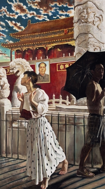 在鐵柵欄的前面,畫家繪出了兩個人物。畫幅右邊的男子光著膀子,打著黑傘,邁步離開威嚴的天安門。這位男子正是畫家本人。他邊走邊向天安門廣場望去,眼睛裡露出一種失望、哀傷的目光。畫家身後有一位漂亮的少女。這位穿著蝴蝶裙的女孩,成為畫面構圖的中心。她跳起身,扭過頭,望著那兩隻凶悍的獅子,臉上露出驚恐、絶望的表情。少女形象是一種化身,她象徵著我們對天安門廣場的美好記憶。然而,這種記憶猶如一隻美麗的蝴蝶,它在驚嚇中跳躍而起,飛向遠方。也許她愛得太深,才會感到如此慘痛。也許她愛得太真,才會覺得如此悲傷。悽慘的少女形象與威嚴的天安門城樓形成一種強烈的對比,烘托出一種慘烈的悲劇氣氛,使得《蝴蝶》這幅油畫展現出一種淒美的藝術感染力。