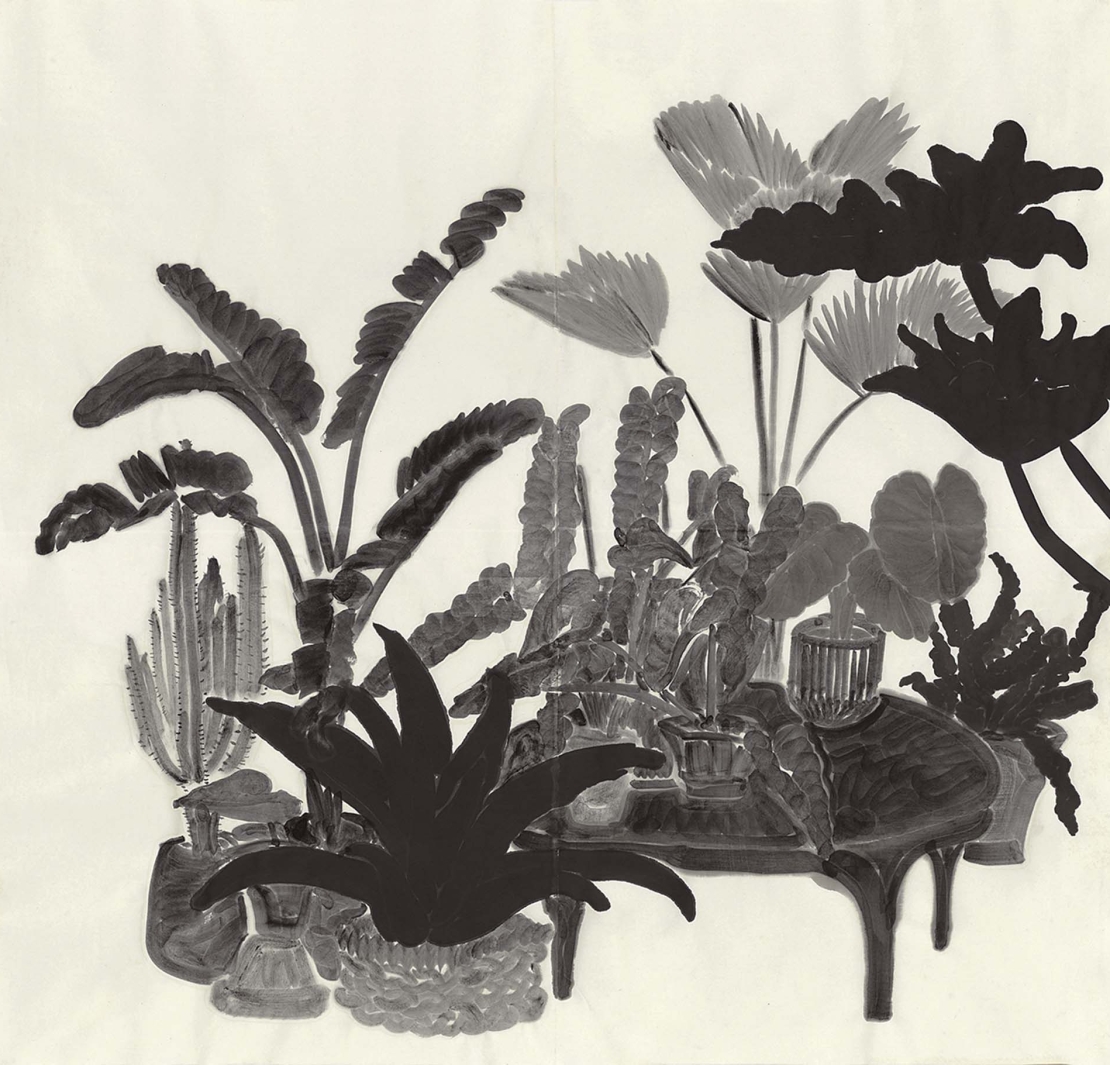 本屆「集保結算所當代藝術賞」歷經兩輪的評審,最終選出包括金銀銅前三名共計22件的優秀作品。從創作的形式上來區分,包括有平面繪畫(件數最多)、機械裝置、錄像、立體裝置、複合媒材;此外,有三件作品是利用AI的軟體來進行創作。本屆評審所選出的金賞是楊寓寧的《觀葉植物》。這件181×192公分的大型水墨作品,雖然貌似傳統的水墨花卉,但其植物的組合,卻以芭蕉葉、姑婆芋等適合臺灣室內栽種的觀葉植物為主。在用墨上作者用到了宿墨與大筆觸的筆刷。配合了裱板的單純裝裱方式,楊寓寧的作品展現了恢弘的氣勢與新的視覺語彙,非常適合陳列於現代的展示空間。