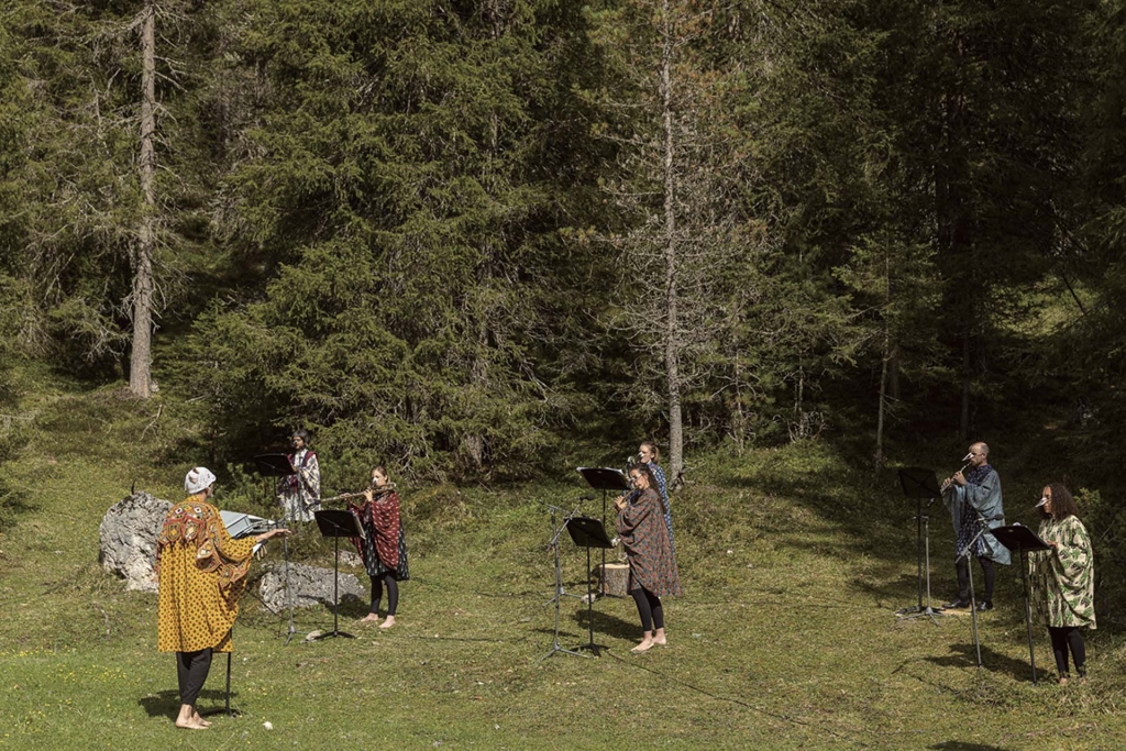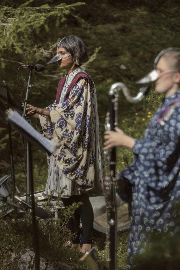沿著塞爾瓦加爾德納的Vallunga綠草如茵的小徑走著,在山谷的陽光與陰影、群木與石頭的交會處,迴盪著Hylozoic Desires的聲音作品。由藝術家與詩人希瑪利.辛格.索恩(Himali Singh Soin)與聲音藝術家David Soin Tappeser搭檔,延續著自2019年開展的跨領域長期系列作品「我們相應如是」(We are opposite like that),以女性視角投射兩極的殖民歷史、神話、融冰的另類觀看,在南北地理的理性對稱之間攪動顛倒、雜訊與迷航的亂流。此次藝術家的開幕演出,化身為全球遷徙路徑最長的物種—北極燕鷗,在七個場景的詩篇中,訴說著漂浮、集體、非線性的生存故事,其朗誦的回音也在山谷與各式生命共振著。