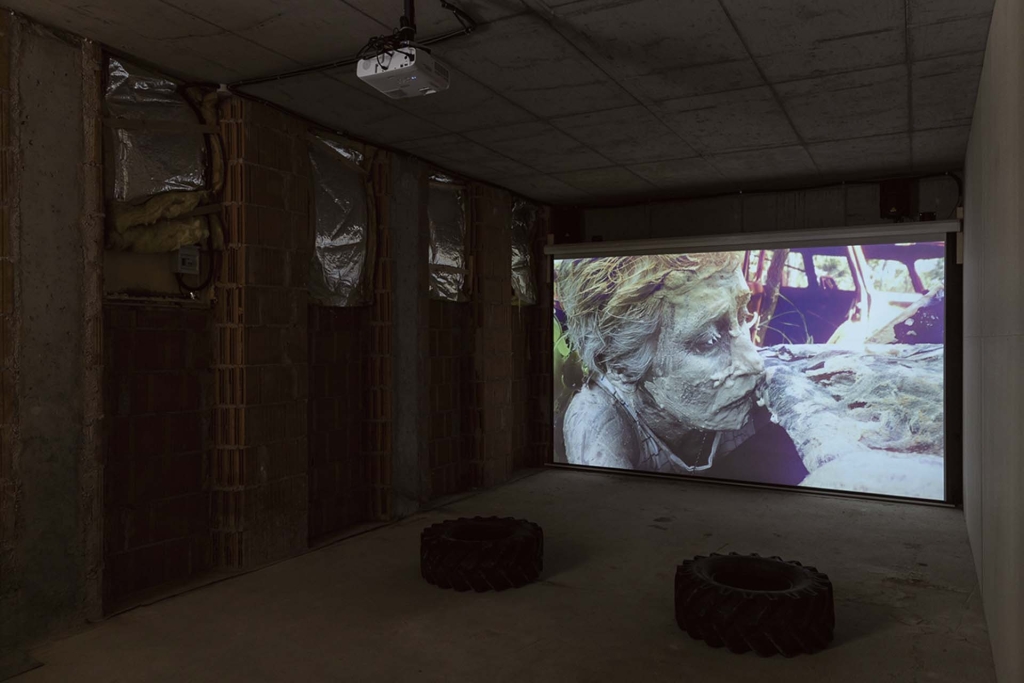 幾公里外,建造於17世紀的加爾德納古堡因為有多個魚池,德文名稱為「Fischburg」。其中一個池子承裝著藝術家雙人組「利維塔.科恩和圖爾.范巴倫」(Revital Cohen & Tuur Van Balen)的作品《蒼白》(Paleness),作品直接回應有蒼白山(Pale Mountains)稱號的多洛米提山脈,以及在地球上有四億萬年歷史的馬蹄蟹,其身體如何與這座山相連—在百萬年前,這裡曾是一片滿布珊瑚礁的熱帶海洋。猶如失去海洋的山脈頓失血色般,這個困在陸上的古老物種,如今也因為其藍色血液有科學製藥價值而面臨瀕危命運。當藍血消失,池子中生命之乳的白色波光中,也映照出牽連其中的我們的臉。