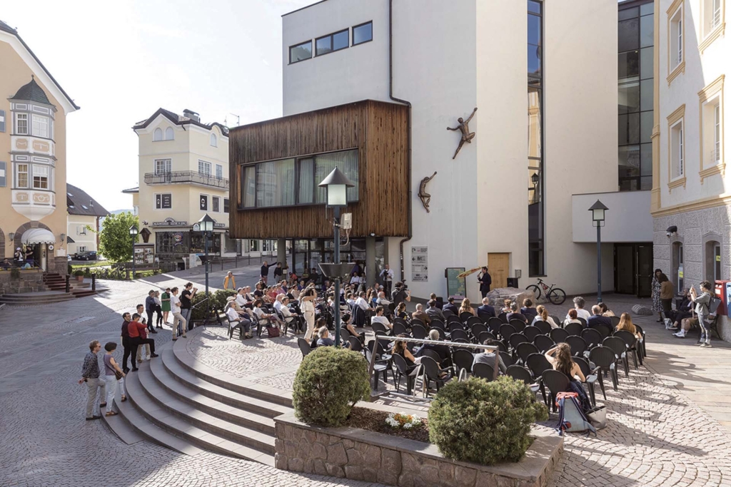 筆者造訪雙年展之際已是冷冽的零度低溫,這段時間,健行登山的遊客剛離開,滑雪的季節也還未到來,原本喧騰的小鎮暫時恢復悠閒的日常風情。搭上纜車,海拔三千公尺處的UNESCO瞭望點被高聳的白石山脈環繞著,腳下的雙年展猶如星叢般,聚集於1,236 米的奧爾蒂塞伊(Ortisei)、1,428米的聖克里斯蒂納(S. Cristina)與1,563 米高的塞爾瓦加爾德納(Selva Gardena),三個沐浴在藍天與日光下的山谷小鎮,再從老飯店、古堡、小鎮的街上,向外向上蜿蜒至更高更深邃的小徑與森林。