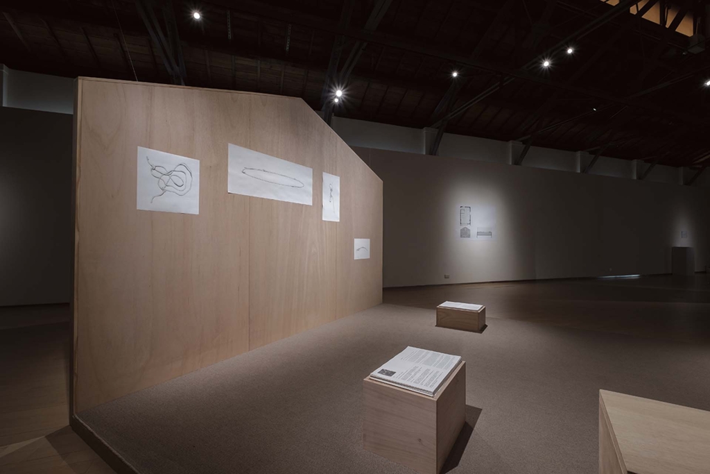 藝術家蔡宗勳在過去的創作中,已經展現他對於記憶與身體感知呈現在空間敘事的敏感度。近期於嘉義市立美術館「壞交易:Tê及跨境」展出的《繞圈》,可說是藝術家藉由文字書寫進行經驗敘事的首次嘗試。扣合著展覽中探討飲茶文化背後含有殖民、貿易歷史,藝術家將田野聚焦在嘉義茶葉林。他以19世紀英國東印度公司聘雇的植物學家福鈞(Robert Fortune,1812-1880)將茶苗盜運出中國的關鍵技術「華德箱」(Wardian case)為原型,將箱型造形連結起自身服役時的蚊帳、移工的工寮、茶葉的溫室、原生家庭的家屋等親身經驗的空間,透過文字串接起個體與外籍移工間交會的生命敘事。藝術家巧妙地將這些走讀文字打散在山形與家屋並置的展場中,讓觀眾自行拼組成各自的閱讀結構,繞行出台灣茶產業文化路徑的跨國面向。