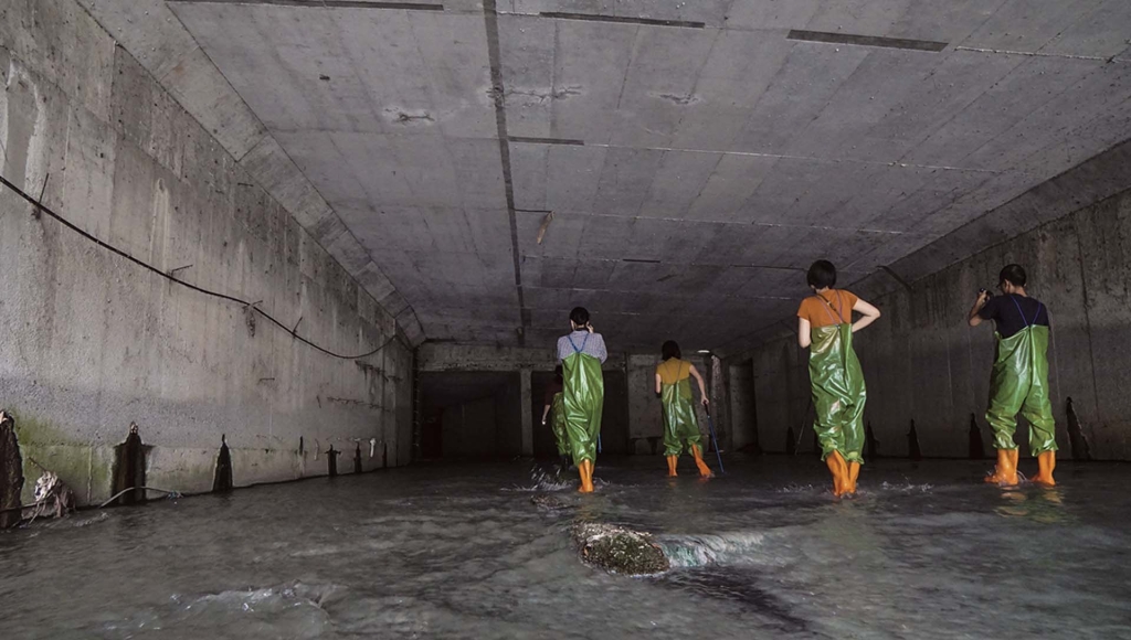 同樣在可見地景下尋找被現代性掩蓋的地方敘事,藝術家劉紀彤在2019年展開的「沿河」創作計畫,同樣以田野調查作為方法,但她更著重個人記憶與身體感知的連結。於是,藝術家身體力行潛入台南市區的地下水道系統,找尋一條城市治理下被隱沒的歷史,讓這些只能言說的「都市傳說」被可視化。在此系列的同名錄像中,可以看見劉紀彤以主觀鏡頭潛行在下水道中,浸身於滿是垃圾、遺構的污水,鏡頭中直面的是藝術家迴返這座暗黑母體的原初欲力,凝視著這座她成長生活的城市。後續藝術家在個展與聯展中,都曾以實地工作坊與走讀帶領觀眾與她同行,並進行更深刻的交流討論。