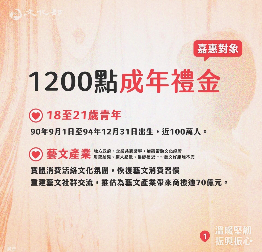 行政院特地為這項政策製作圖卡,標示18歲至21歲的公民(2001年9月1日至2005年12月31日之間出生)每人將可領取1200點(視同1200元)的文化禮金,消費標的述明了五大類:看展覽、看演出、買書、看國片、買文創或工藝品。