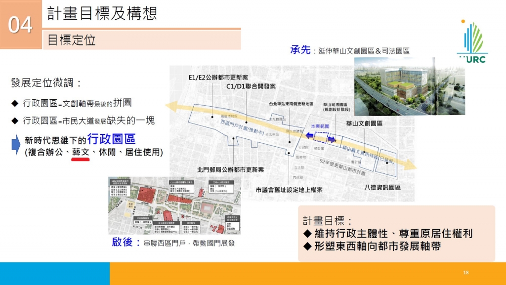 以國家住宅暨都市更新中心(簡稱住都中心)訂出的《修訂臺北市中正區華山地區行政專用區(三)範圍土地使用管制規定細部計畫案暨劃定臨沂段都市更新地區範圍案》裡的簡報得知,這個公辦都更地案範圍以市民大道、天津街、北平東路、林森北路圍繞的街廓為主,從2003年就有中央合署辦公大樓為規劃,然而公、私產權交雜,始終未能有處理的定論推動有效開發。直至近年納入另一處以國有地為主的「臨沂街區段」(杭州南路一段11巷、齊東街70巷,近臺灣文學基地、齊東詩舍的巷弄地段)整合考量,讓市民大道旁的街廓整合開發為中央行政辦公大樓,而後者在齊東街巷弄的區域為住三用地,將民用住宅用地產權以交換容積的方式就近易地開發。