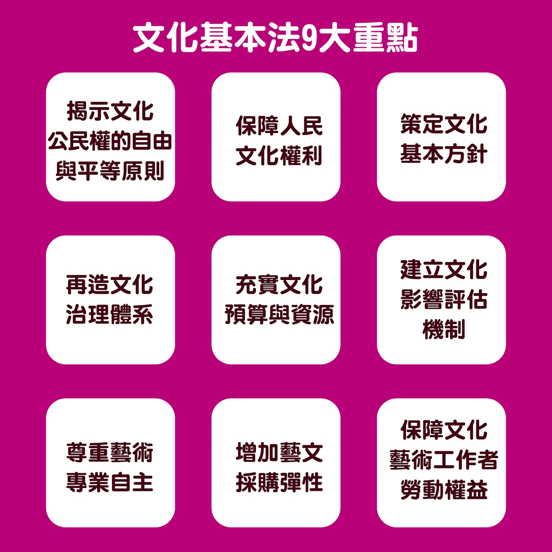 其中第一項「參與文化生活與接近文化藝術之權利」,對外呼應兩公約等國際法,對內的國內法則對接《文化基本法》和《地方制度法》;同時對接在憲法的基本人權有特殊的強化意涵,強調「文化之於人,與基本人權有不可分割」;另也闡述了文化平權、文化近用、藝文生態環境各種機制的齊備。