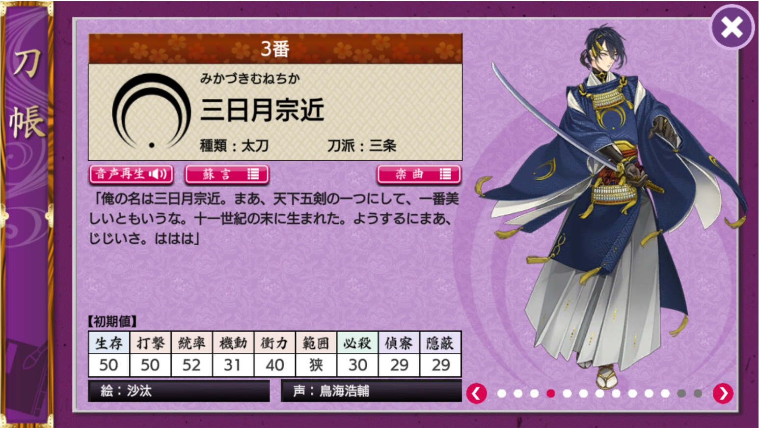 以《三日月宗近》為藍本設計的「刀劍男士」身襲平安時代狩衣改造的服飾,深藍底色象徵夜空,映襯出胸前與袖擺的金黃新月圖樣,呈現出原刀的鑄造年代與美學特徵。