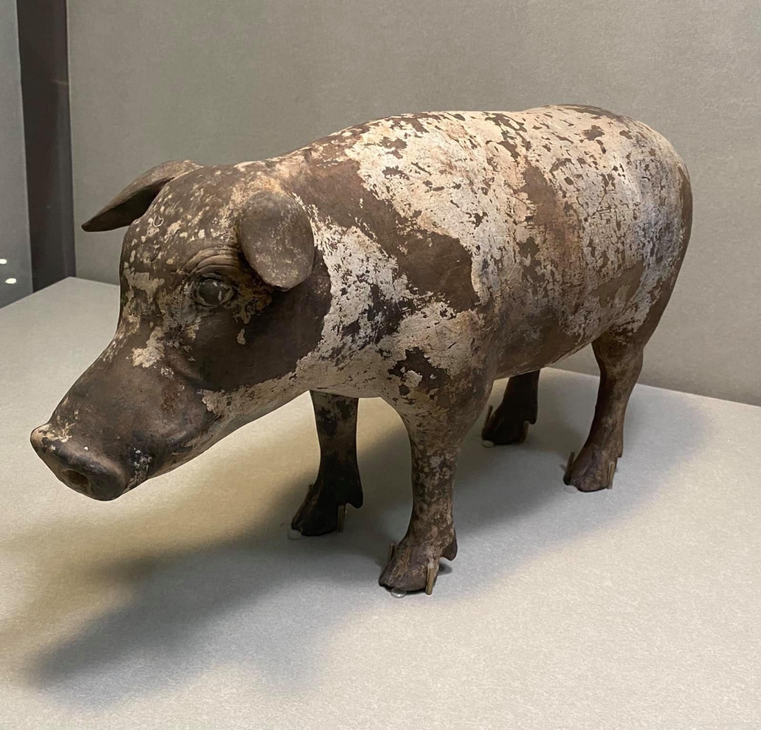 該作品是西漢彩繪陶器,桶型巨嘴,憂鬱眼神,斑駁身軀,古色古香,但因為只展單隻,顯得形單影隻,孤零零的,更增添憂鬱孤單色彩。許多朋友看過曹興誠收藏的陶豬作品,體型不大,十分討喜可愛。為什麼不展出母豬,他也感到不解,但一直沒有得到故宮博物院的回應,迄今成謎。