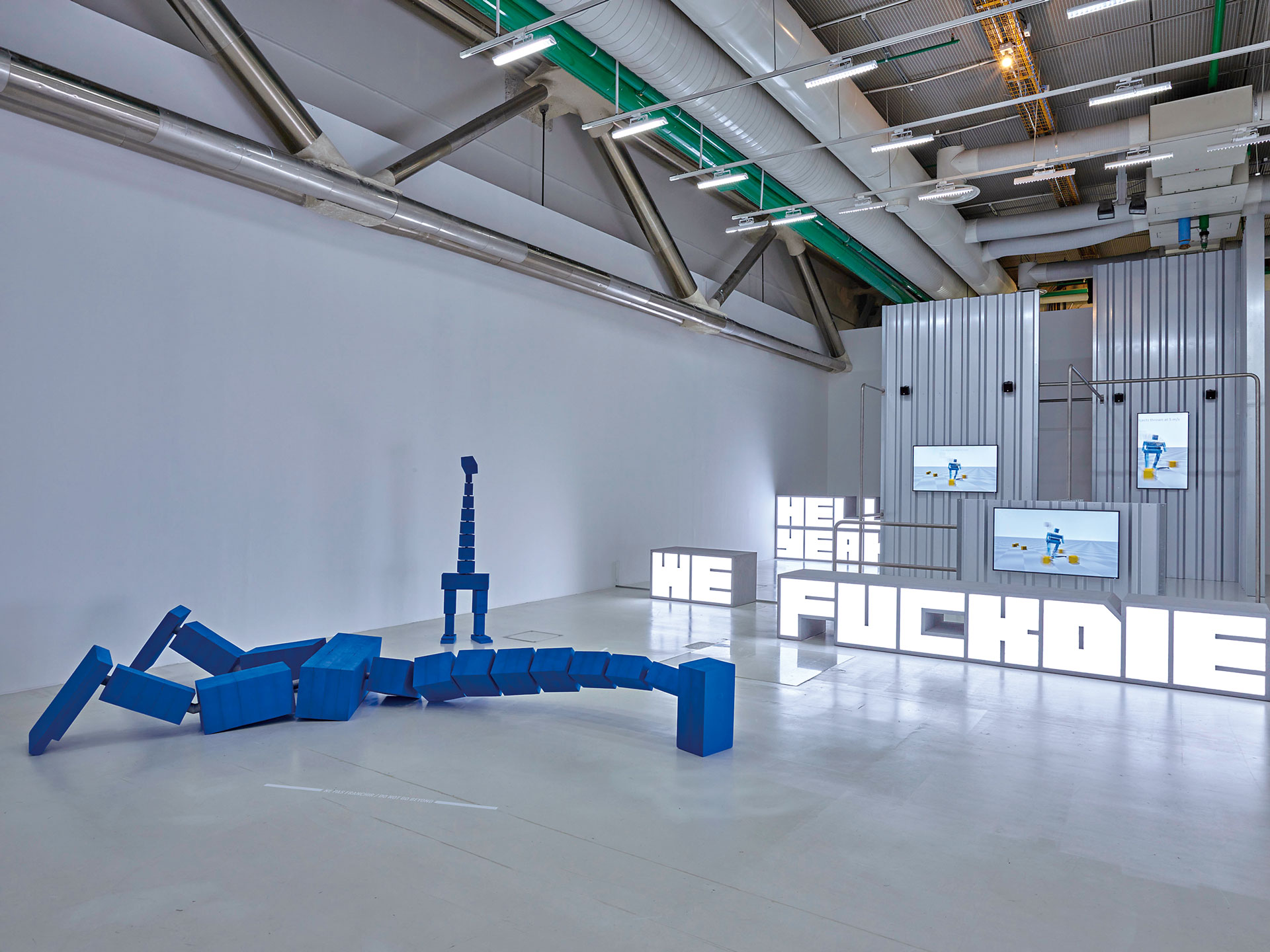 利斯特:應該說有好幾條線索。首先是人工智能(Artificial Intelligence)的議題,它同時也做為整個展覽的起點——作品《Hell Yeah We Fuck Die》(2017)諷刺工程師針對人形機器人所進行的一系列測試。史德耶爾觀察人工智能如何被設計來取代大量的人類活動——而且逐漸加大操控程度。人工智能影響了我們在這個世界上的判斷和行動能力,它迫使我們融入概括評估人事物的原則,維持和績效以及努力遵守社會模式與生產力模式的關係。另一條主要線索是展覽副標題「實體與虛擬空間」所呈現的明顯對峙。事實上,史德耶爾從紀錄片導演的工作路徑,即走出工作室,進入公共空間展開調查——例如《空的中心》(1998)呈現了這種田野調查方法;她在柏林向波茨坦廣場附近居民詢問對圍牆倒塌的看法——到深切體認到公共空間已不存在這個事實。如今絕大部分的都市空間都已經被私有化和監控;盈利和控制取代了把這些空間視為所有社會經濟階層人士所共有、共享的免費人民資產來自由使用。事實上,史德耶爾告訴我們,儘管受到某些私人平台的控制,今天的網路空間代表公共空間的部分延伸, 而正是在這個虛擬的世界裡,自由流通和分享的可能或不可能獲得了重新演繹。