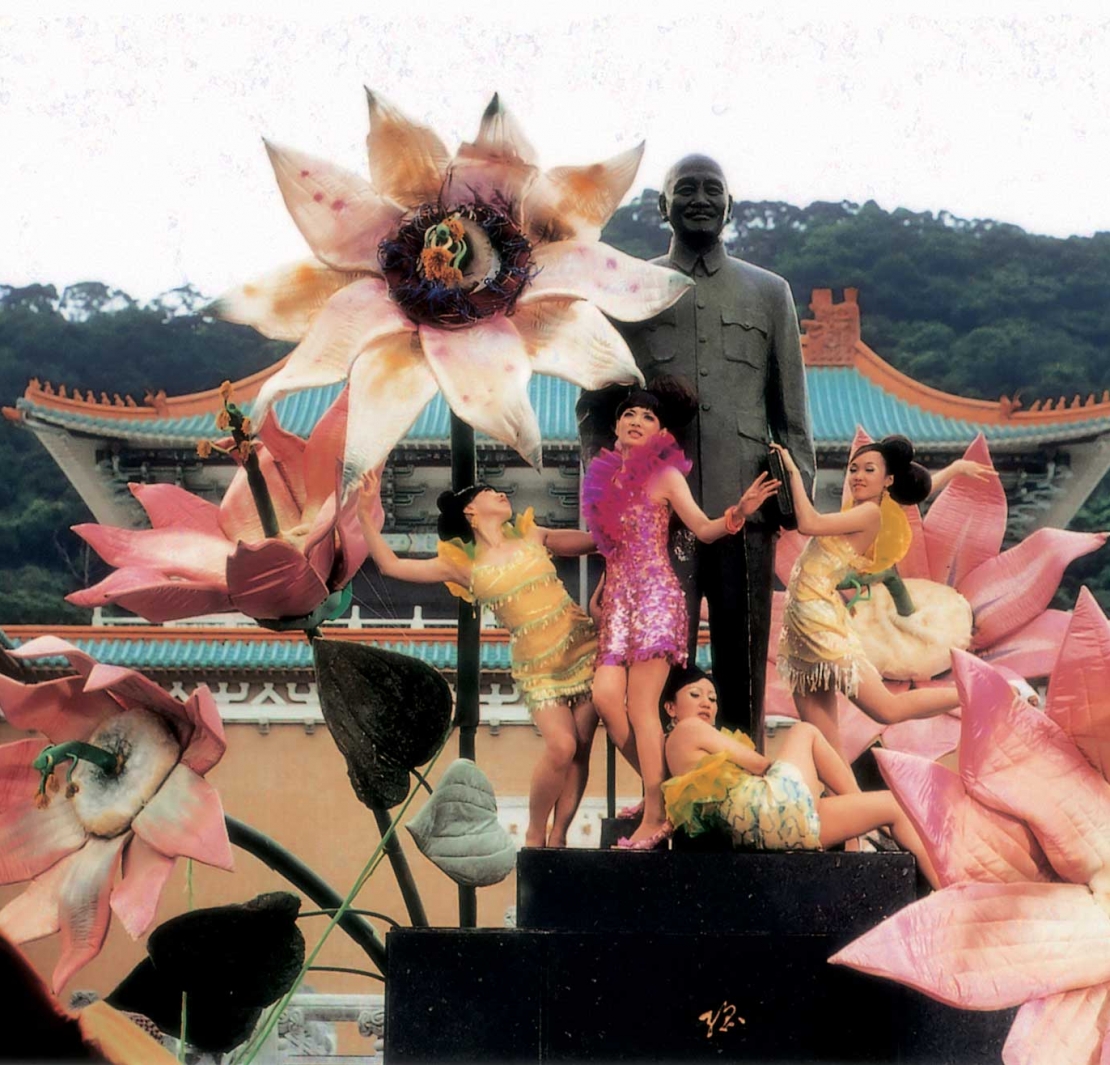 《天邊一朵雲》敘事上將現實世界與幻想世界裡的歌舞橋段交錯,女主角陳湘琪飾演的故宮解說員暗戀著李康生飾演的AV男優。當中一曲《愛的開始》奏下,將故宮中央主樓前的廣場幻化為歌舞的舞台,陳湘琪以挑逗愛撫與即將拆除、具陽具象徵的蔣公銅像對戲,臺式風格的坎普展演削弱了中華文化威權的神聖性 。這樣在廣場歌舞的情境也像是在暗喻蔡明亮、電影藝術只能站在專門收藏中國古美術珍品的故宮外頭,不得其門而入,過去他還曾在博物院外頭賣過電影票。