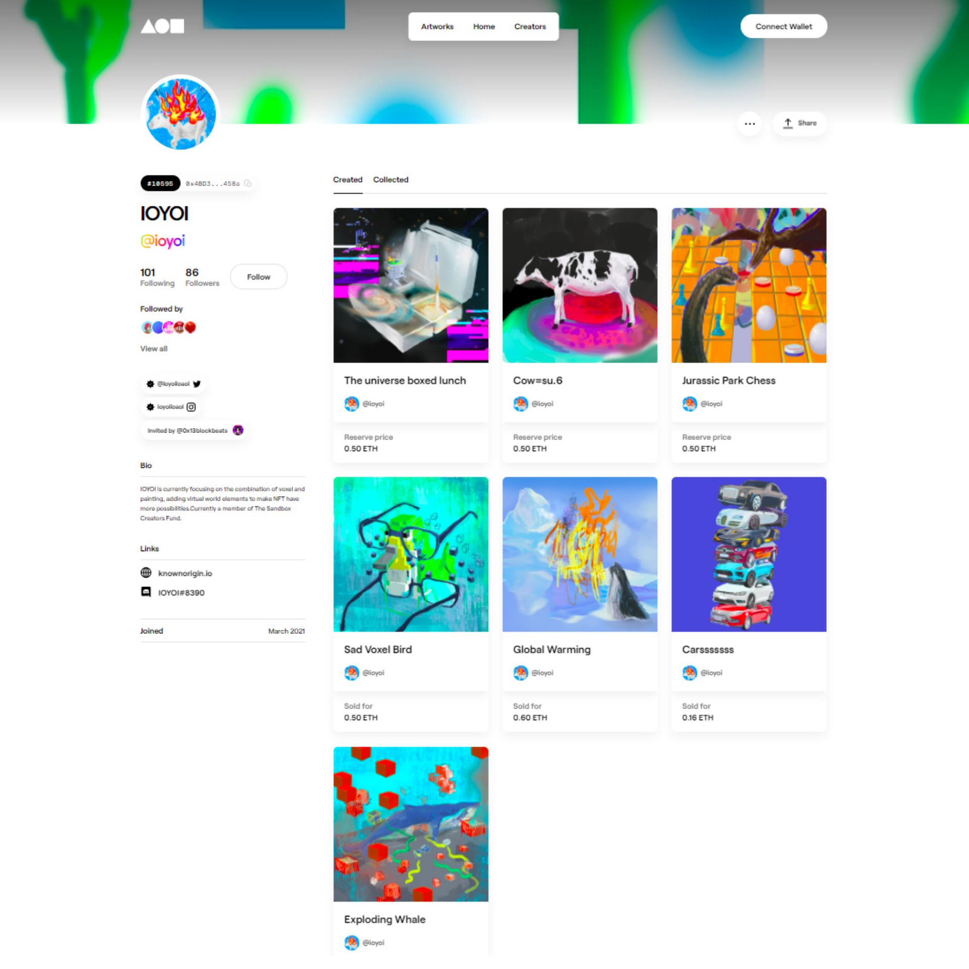 「IOYOI」是洪司丞自高中沿用至今的遊戲暱稱,現在則為他於加密藝術(Crypto Art)世界裡的代稱。身為傳統藝術學院出身的他,多年來投入加密藝術創作與的推廣,是台灣活躍於世界範圍內加密藝術圈的第一位NFT藝術家。早在2017年,洪司丞就開始探索對區塊鏈與藝術的連結性,但當時,他發現早期公開的資料是以虛擬貨幣或實體作品上鏈資料庫為主,並未有初階段NFT相關資訊。但這一節點,美國數位藝術平台SupeRare開始對NFT進行布局。2020年初,區塊鏈沙盒遊戲Decentraland開放虛擬空間,洪司丞在此認購了首個虛擬空間,自此開啟了NFT創作。