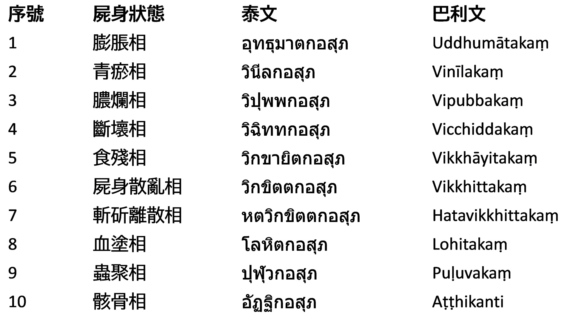 上座部佛教依照屍體腐化的階段,細緻地發展出10種觀屍冥想。每一種屍體狀況,各有對應的冥想指引、持誦與修行標的。舉例而言,「膨脹相」要觀想屍身脹氣鼓起的畫面,適合貪戀身形的人;清所練習的「蟲聚相」,則必須不斷地在腦海回放屍身佈滿白蛆駐蝕的情景──連最能為己所控的身體,都能被蛆蟲佔有,那還有什麼是專屬自己的呢?透過蟲聚相練習,僧侶得以突破自己對「身為我所有」的依附。