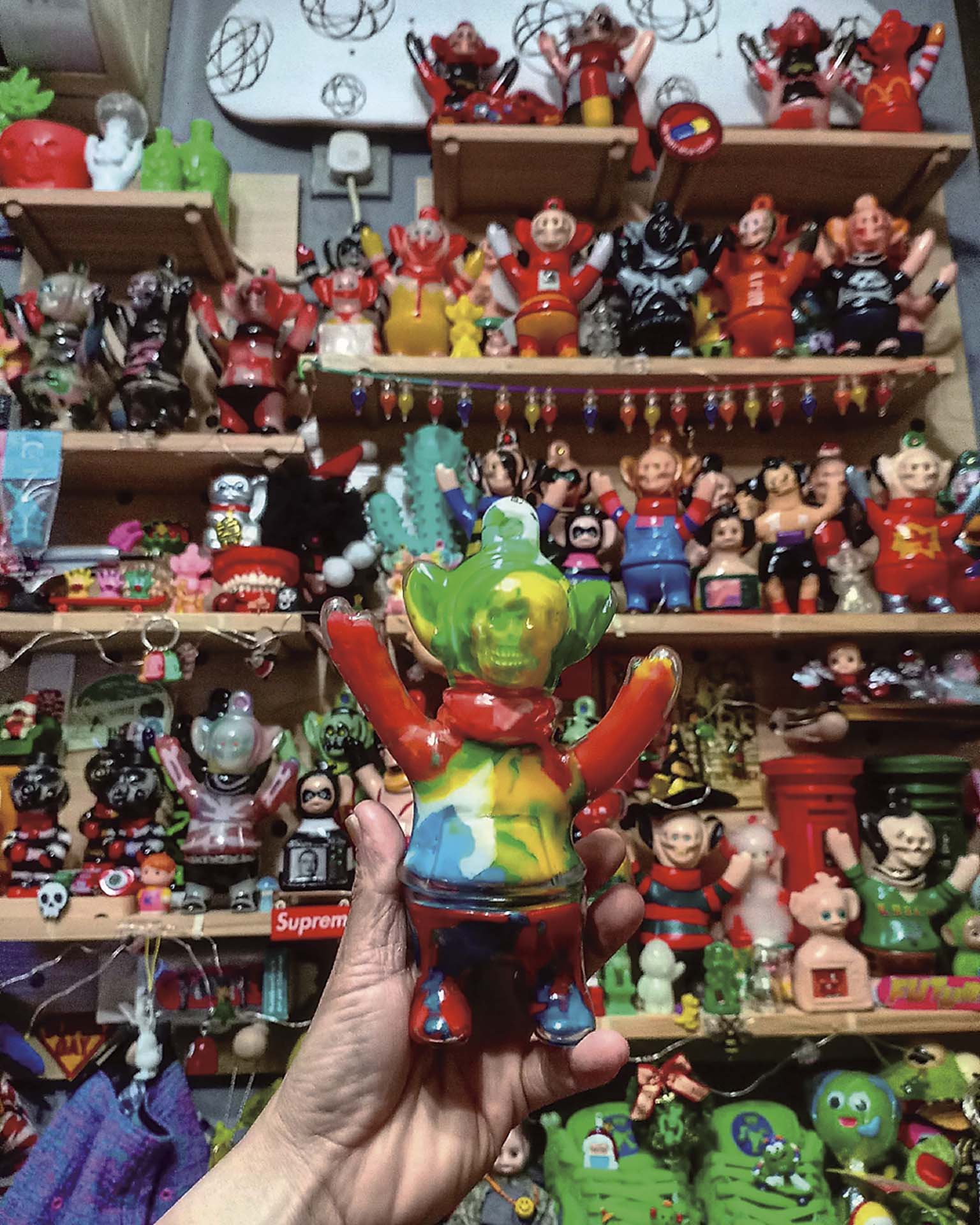 而正是在這段沉澱的歲月裡,楊子健重新拾起了對玩具的熱情。伴隨著當時搪膠文化的興起,他開始用紙黏土摸索,在店舖的一角,日復一日地打磨、上色,創造出一個個奇異的怪物。這段看似土法煉鋼的過程,卻因緣際會地遇上了貴人──香港本地的創作組合「Don’t Cry in The Moring」。