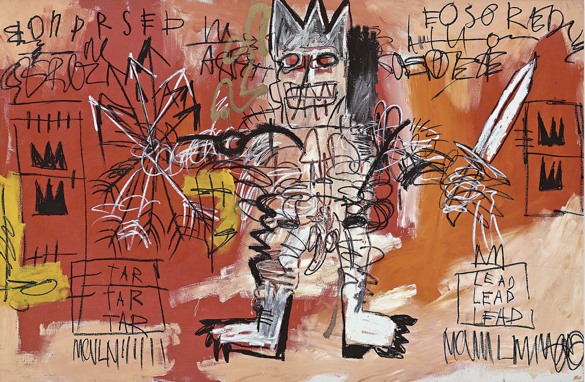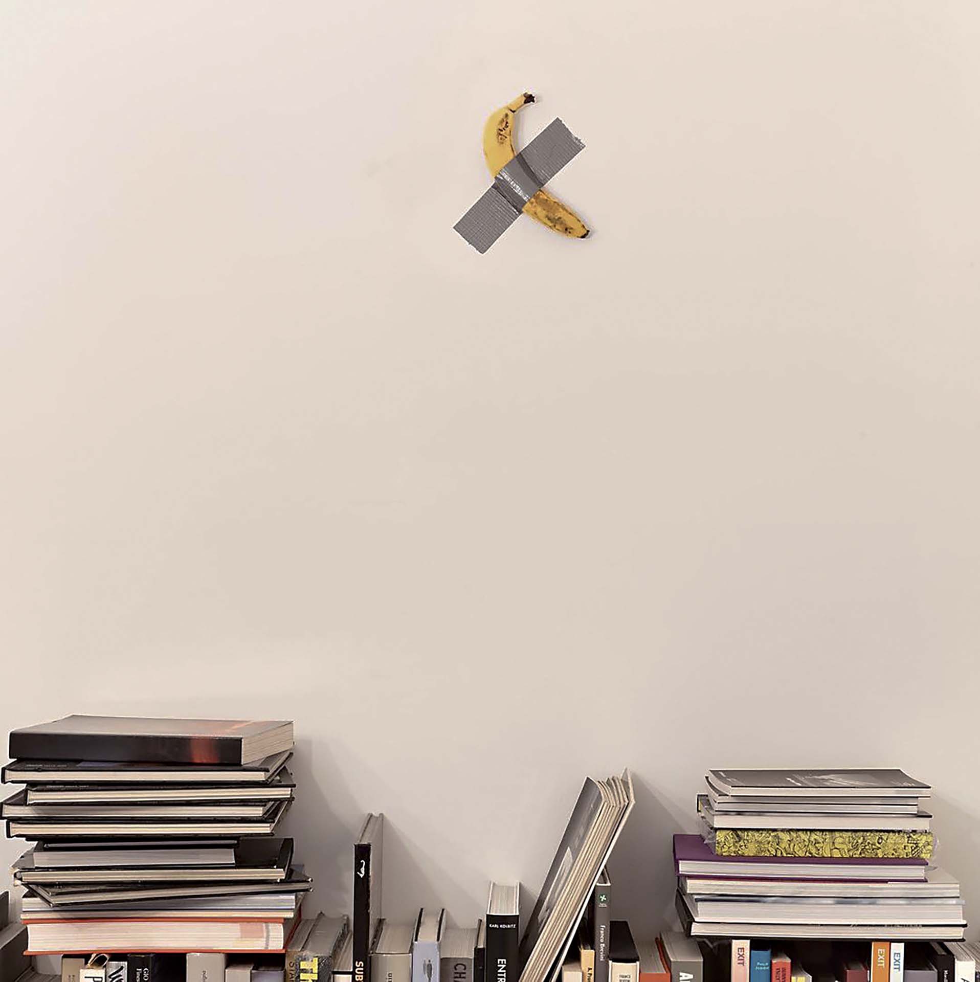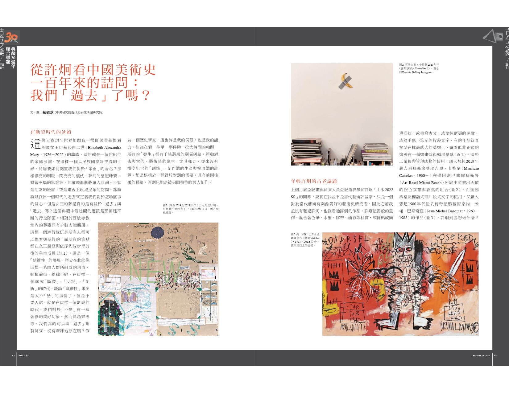 上個月底亞紀畫廊負責人黃亞紀邀我參加許炯「山水2022 SS」的開幕,說實在我並不是當代藝術評論家,只是一個對於當代藝術有業餘愛好的藝術史研究者,因此之前我並沒有聽過許炯,也沒看過許炯的作品。許炯塗鴉般的畫作,混合著色筆、水墨、膠帶、油彩等材質,或拼貼成簡單形狀、或書寫古文、或塗抹斷裂的詞彙、或隨手寫下筆記性片段文字,有的作品就直接貼在挑高諾大的牆壁上,讓看似非正式的塗鴉有一種壁畫或街頭場景感(圖1)。這些工業膠帶等現成物的使用,讓人想起2019年義大利藝術家莫瑞吉奧.卡特蘭(Maurizio Cattelan,1960-)在邁阿密巴塞爾藝術展(Art Basel Miami Beach)所展出並賣出天價的銀色膠帶與香蕉的組合(圖2),而塗鴉風格及標語式或片段式文字的使用,又讓人想起1980年代紐約傳奇塗鴉藝術家尚-米榭.巴斯奇亞(Jean-Michel Basquiat,1960-1988)的作品(圖3)。許炯到底想做什麼?