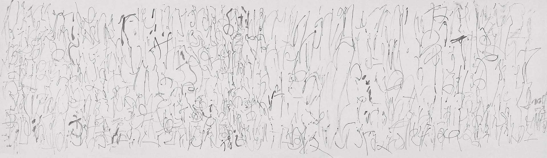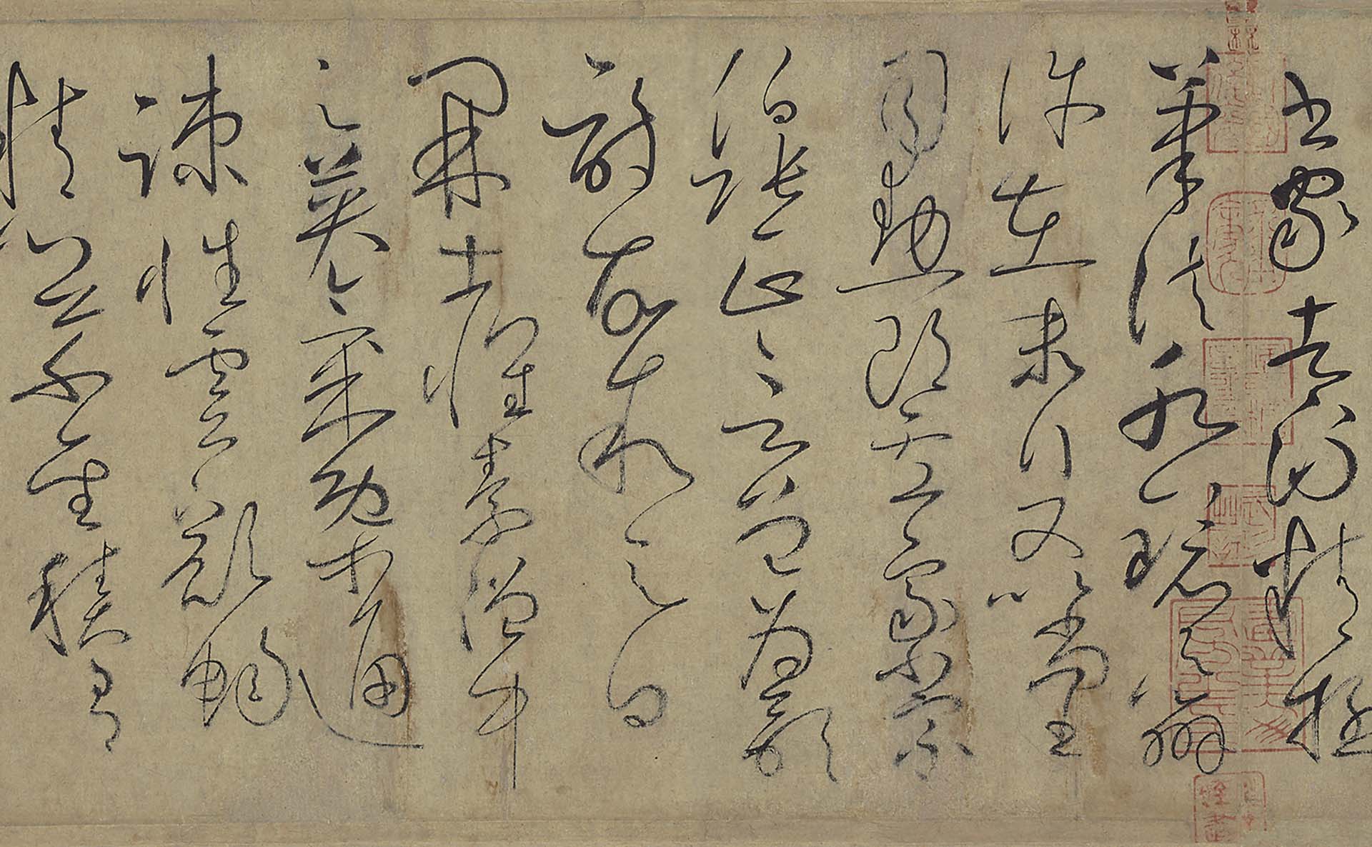 跟亞紀聊天,才知道他原來是書法專業出身,便約了過幾天去看他早期的作品。許炯早期的草書時期,例如2015年的《蘭亭序》(圖4),用類似唐代懷素《自敘帖》(圖5)快速連綿的字體,展現書寫的隨機性與表演性。然而比起懷素,許炯線條的粗細變化更少,呈現出近似現代硬筆書寫的效果,畫面的重複性線條,藉由疏密創造出不同的空間,整體呈現出更壓抑、更極簡的現代感。這樣的現代感帶有一種孤冷的詩意,與懷素狂草所呈現酒酣耳熱下的放縱是很不同的。對當代觀眾來說,雖然有標題的幫助,我們知道這幅畫的內容應該是書寫有名的王羲之《蘭亭序》,但是應該很少人真的能一個字一個字讀出來,因此與其說標題指出這幅作品的書寫內容(雖然的確是其書寫的內容),還不如說像是這件作品的副文本(Paratext),是開啟這件作品與一個更大脈絡相連的按鈕。這件一般觀眾讀不出內容的作品究竟是叫作《蘭亭序《自敘帖》,或像徐冰的「方塊字書法」一樣取一個新發明的名字?其可能不影響到作品的風格表現,但卻一定會影響到作品所要帶領我們進入的世界與對話。