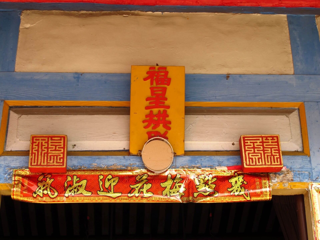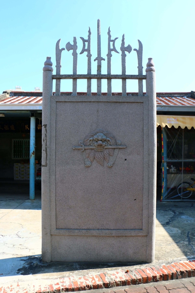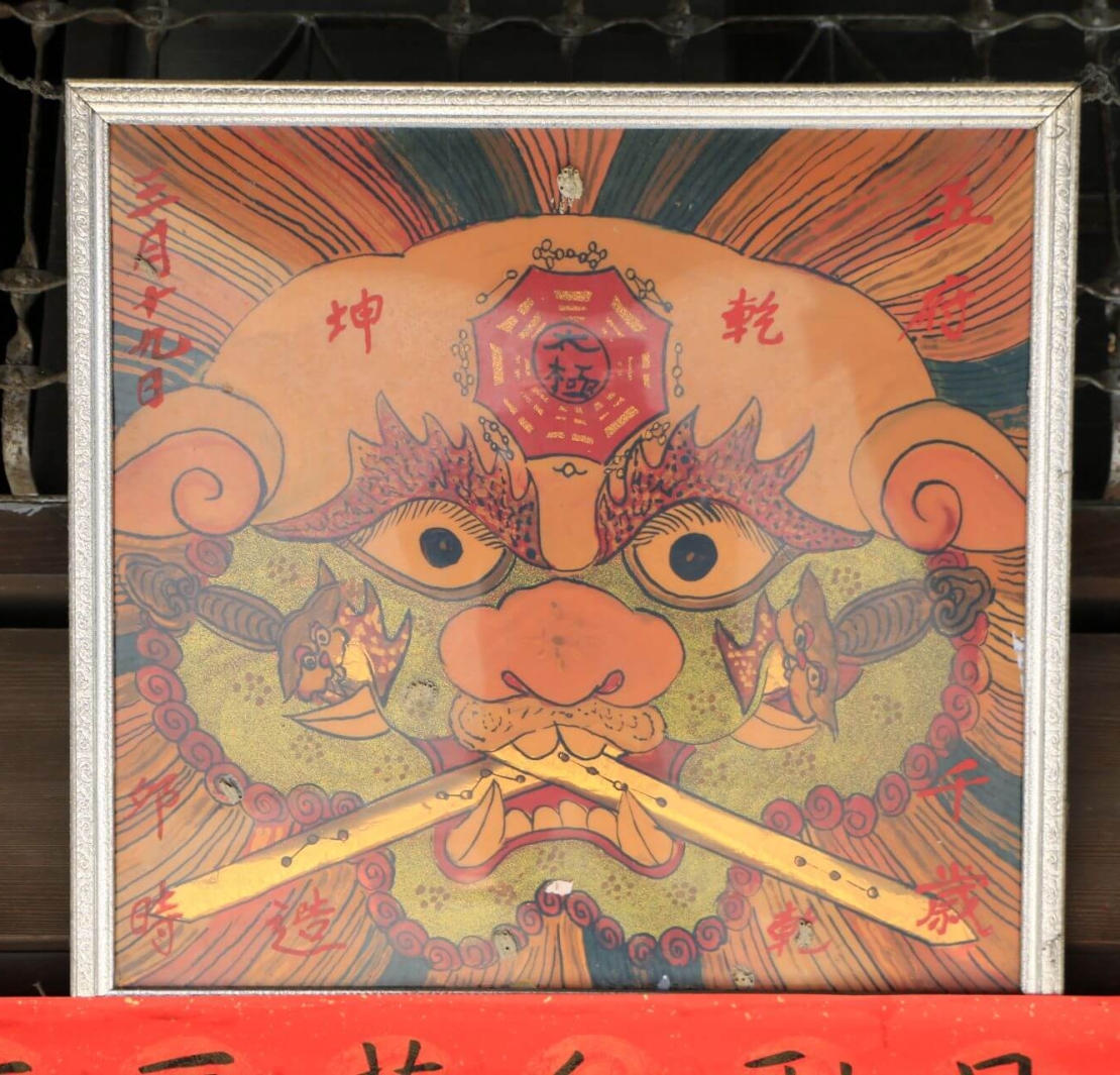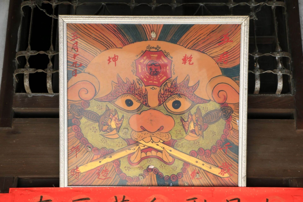 民居辟邪物舉例來說,傳統民居的辟邪物在建築外的屋埕或圍牆可以見到刀劍屏、照壁、陶符、竹符、石敢當等,建築本體的屋頂上可以見到烘爐、陶罐、碗、仙人掌、瓦將軍等,牆壁可以見到壁鎖、字牌等,門楣上可以見到八卦牌、倒鏡、山海鎮、獸牌、麒麟牌、劍、符籙、柳枝等,門上可以見到春聯、門神等,室內可以見到安樑物、鏡符、楊公礅等。綜言之,民居辟邪物的位置是分佈在中軸線上的屋頂、正門,顯示辟邪物所要保護的是民居的神聖空間,即供奉神明與祖先的正廳,這裡是整個家族命脈傳衍的象徵、是福運之所在,虛被謹慎地保護。