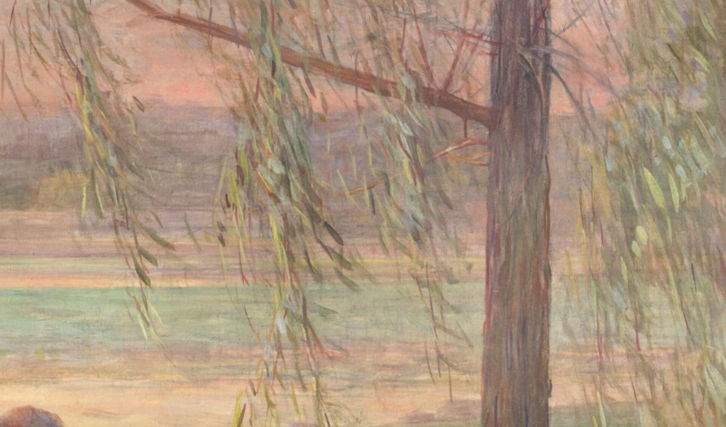 然而更值得注意的,是畫家如何呈現夏季傍晚的「納涼」意境,檢視藤島武二描繪樹葉的細節,可以注意到雖然他在處理樹幹的質感與立體感的方式不太成熟,但仍透過靈動的筆觸以筆尖表現樹葉被風吹動的效果,具有良好的作畫技巧。 畫中正值傍晚時分,暗紫色的陰影壟罩各處,與中景不忍池水面上的黃橙色夕陽光芒形成對比。從這些細節,可以觀察到畫家如何掌握學院美術的作畫邏輯,去重新詮釋像「納涼」這樣,過去作為日本浮世繪的經典主題。