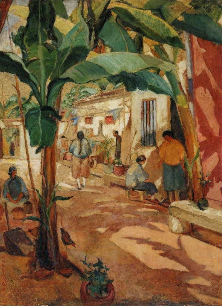 有研究者說:「即使當時有許多描繪臺灣地方色彩的作品,但很少有一幅油畫如此專注在光影的表現上。」(註1) 確實,初看《有香蕉樹的院子》,我們會被紅牆、綠樹構成的畫面主基調所吸引,然而真正佈滿整個畫面的,是在樹葉、地面、牆壁上無所不在的影子。沿著影子的分布,可以發現畫家留意陰影在不同材質上的顏色、明度差異,並且隨著空氣透視遠近,漸漸提高影子的明度。同時,畫家將高彩度的紅牆綠樹安置於畫面前景,遠景則以白牆為主,而這正好與光影、透視的空間整體層次呼應。沒錯,雖然這幅作品叫《有香蕉樹的院子》,但光影才是畫中真正的主角。