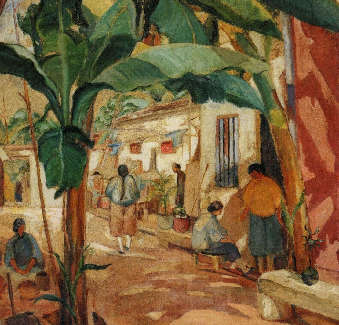 陽光照在厚重的香蕉葉上,使葉子表面呈現淺綠、淺藍色的亮面,未被照到的部分,有時是以墨綠或黃褐色的筆觸處理。光是欣賞畫家如何處理香蕉樹葉與光線之間的關係,就足以令人流連許久。然而畫中陽光透過枝葉灑落在泥地與牆壁上,所形成豐富的陰影變化,更是值得我們細細品味。品味什麼?品味畫家如何將眼前所見自然造化的現實光影,運用不同明度深淺的筆觸顏料再現於畫布上。