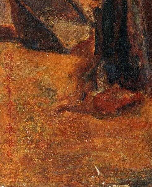 畫家——廖繼春(1902–1976)藉由影子,將整幅畫作的顏色、空間等要素緊密相連,彼此相輔相成,營造出和諧而層次豐富的視覺效果。創作過程需要理性的布局,且每一筆都要思考對畫面整體的影響,但是仔細注意陰影的色塊,會發現他在描繪的過程中並非一次到位,相反,從陰影中細微複雜的色彩變化,以及筆觸帶動的凹凸紋理痕跡,可以看出他花費很多心力修飾,並且不斷地堆砌、塗抹,於極其細膩的微調下才完成。「他特地選擇臺南住家前有香蕉樹的庭院為大作的題材,在刻意求精下,從初稿的構想到賦彩完成,總共花了一年多的時間。」(註2)直到逼近寄送作品至日本東京參加帝展的期限,才在畫作左下角以謹慎而方整的楷書一筆一畫地寫下「昭和參年九月 廖繼春」。