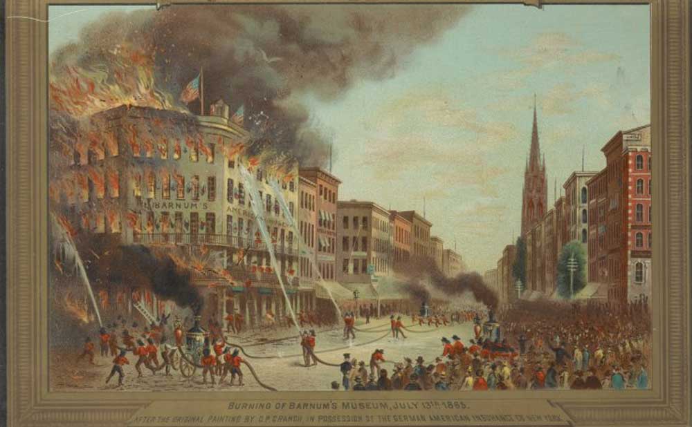 電影大娛樂家(The Greatest Showman)改編自19世紀美國傳奇人物巴納姆(P. T. Barnum)的故事。片中巴納姆的美國博物館(American Museum)是既有標本,也有馬戲、蠟像、表演的多元娛樂場所,為他賺進大筆鈔票,只可惜巴納姆如日中天的事業因大火不得不中斷。現實生活中巴納姆的美國博物館的確也在1865年慘遭祝融之災,夷為平地,所幸當時正逢午餐時間,館內觀眾不多,得以順利疏散。危急中有人打破鯨魚魚缸試圖救火,蟒蛇因籠子翻覆也享受了短暫的自由。雖然烈燄沖天,局勢緊張,但看熱鬧不嫌事大的群眾,一圈又一圈的圍住現場。混亂之際忽然有人驚呼有生還者脫困!果然有一粉衣女子在消防隊員小心護送下從高樓層抵達地面,不過群眾緊繃的情緒在發現女子是尊蠟像後,馬上鬆弛下來,轉而回頭繼續研究從火中彈射而出的是不是袋鼠。