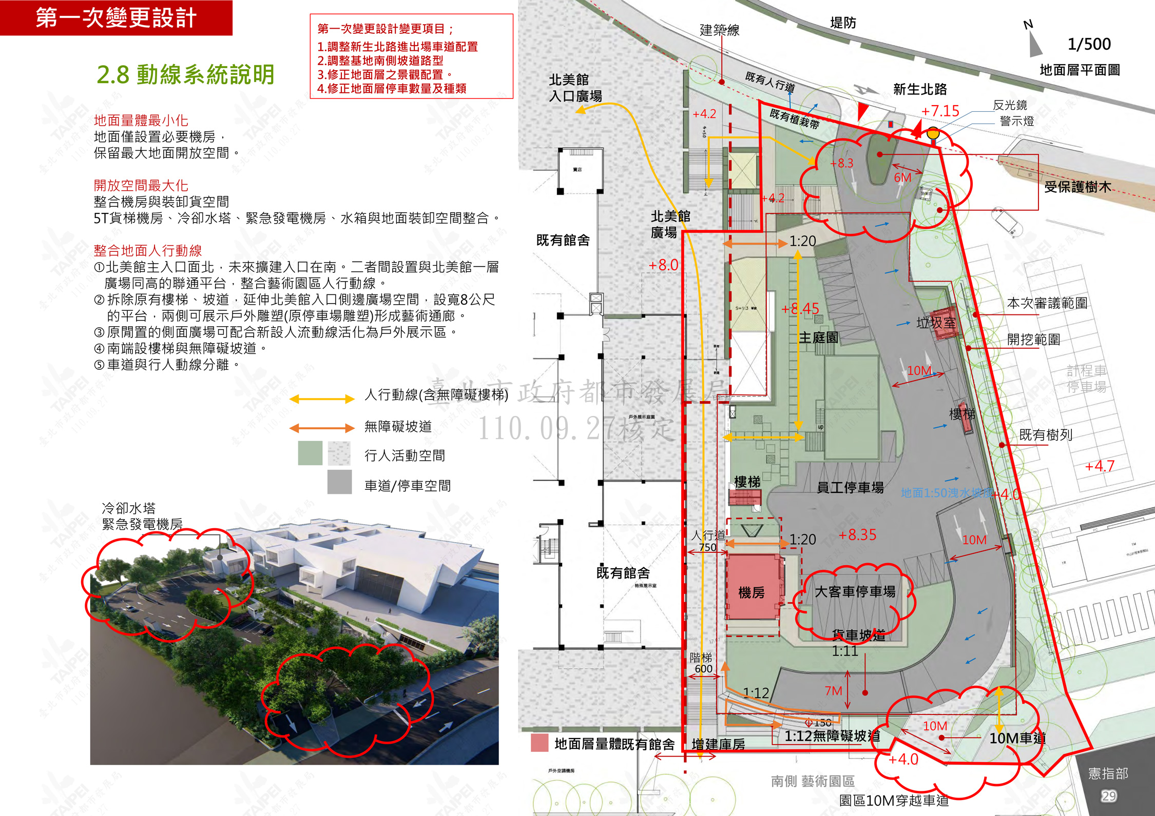 石隆盛指出,以目前北美館擴建工程中的公開閲覧資料顯示,停車場入口設在中山北路,也就是未來新館臨中山北路的30公尺人行步道上, 將橫切出寬16.3公尺的車道,阻斷行人前往新館入口的去路,顯然與近年道路規劃思維背道而馳。