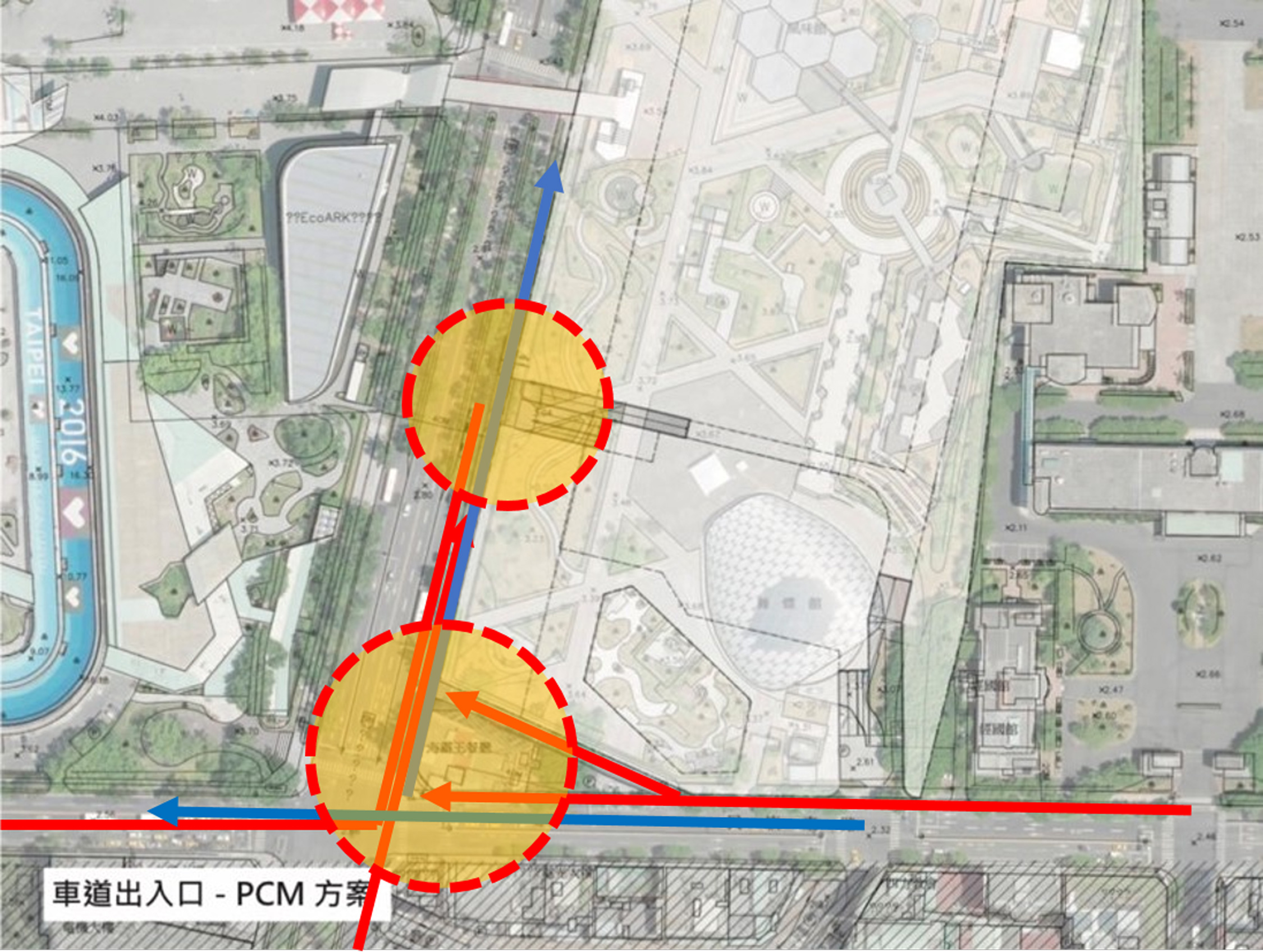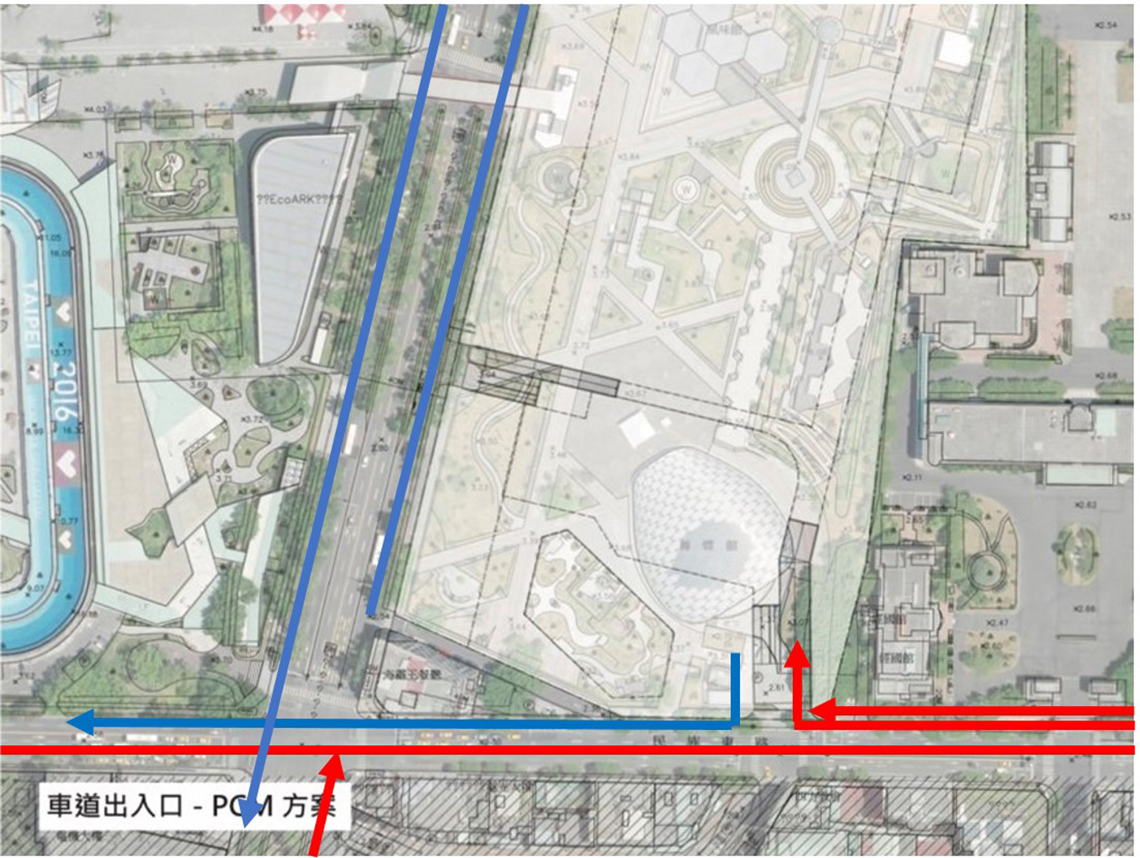 而離開停車場的車流動線,石隆盛也認為,不會和進場的車流交會,可以避免相互阻斷的問題發生。(如下圖)