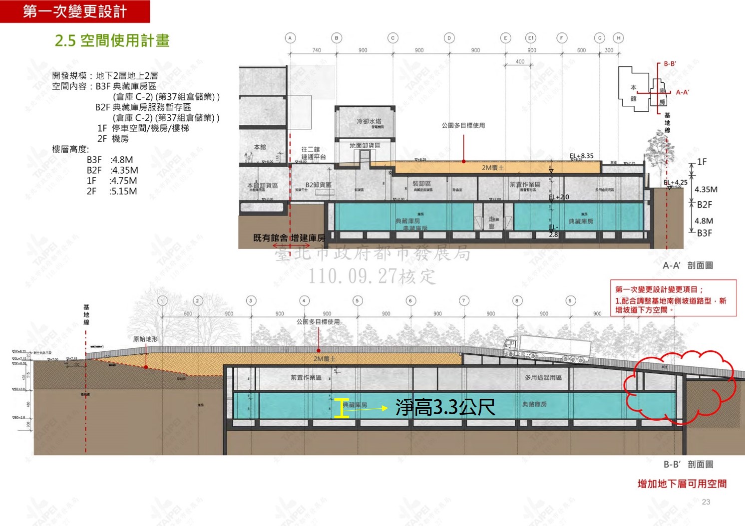 還有,地下樓層的建築,成本遠高於地上樓層之外,空間高度也會因經費關係,典藏空間淨高只有3.3公尺,空間不足日後對於大型作品的典藏勢必會有問題,像林布蘭的《夜巡》、畢卡索的《格爾尼卡》這類大尺幅的作品,根本進不了北美館的典藏庫房。