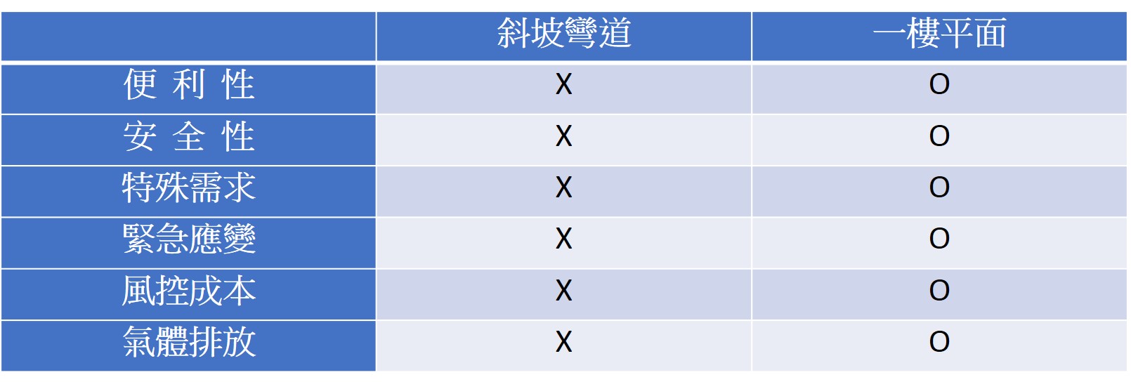 石隆盛強調,不論從便利性、安全性、特殊需求、 緊急應變、風控成本、氣體排放…,等等角度來看,都不如設在一樓平面來得有優勢。以「風險管理」的角度來看,石隆盛說,不僅增加風險等級,也會讓「風險管理」更形複雜,日後相關支出,恐怕會是另一筆費用。