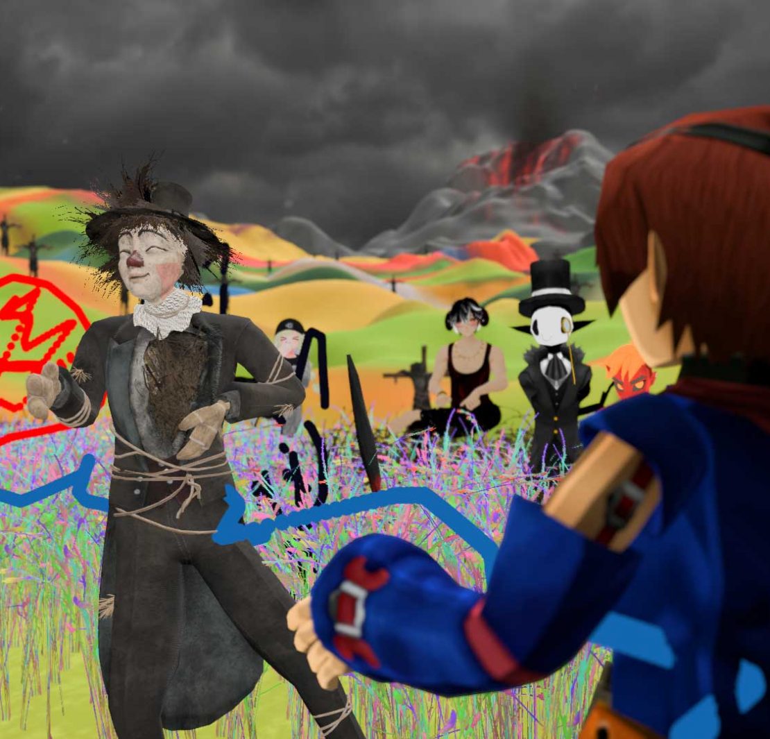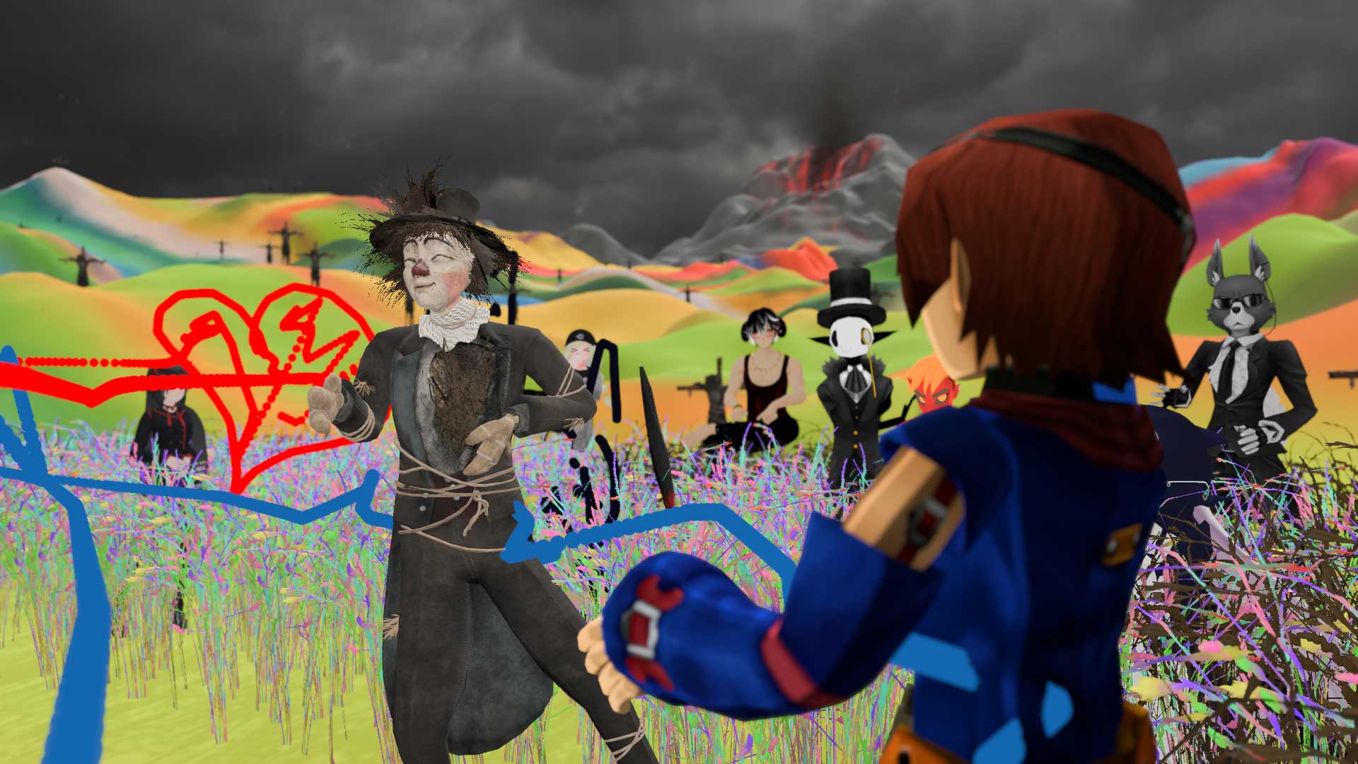 虛擬性如同虛擬與現實的間距,從中孕育讓觀者身歷其境,跨越地域的共時體驗。筆者曾親身體驗2021年高雄電影節參展的《拯救稻草人》(Scarecrow VRC),該作品同時也在「未來浸行式─5G VR內容展演系列活動」以5G連線進行跨地互動。《拯救稻草人》為韓國導演鄭志䧋(Jihyun Jung)與李丞茂(Sngmoo Lee)創作團隊製作的VR即時線上互動演出作品。在體驗過程中,韓國端以真人穿戴動作捕捉系統,靈活地讓肢體動作與臉部表情傳達情緒與某種敘說感。臺灣端則讓觀者穿戴頭戴式顯示器,化身為故事中的虛擬角色與稻草人進行即時互動聯繫。臺韓5G連線的元宇宙,讓異地的虛擬角色,共同在影片中創造故事。儘管我們最終都能化解稻草人的危機,但是每個人與稻草人的溝通都會留下獨一無二的痕跡。為了強化互動式的沉浸體驗,《拯救稻草人》在故事的推進中,適時讓現場瀰漫與敘事有關的「味道」,觀者能透過嗅覺產生體感空間,迅速地融入敘境中的氛圍。體驗結束後,當虛擬角色彼此擁抱的那一刻,其實早已忘卻一開始進入虛擬世界的疏離感,反而開始擁有離別的傷感。雖然這是虛構的故事,但VR的體感經驗,能將同理心與感同身受的過程摺疊進視窗,呈現在眼前的視野。這意謂著,VR基於現實的媒介化,在高度人性化、強化互動性,以及多重感官的特性中,風景則不單是個人觀看的視線,更關乎體驗、參與的感知過程,科技如何以模擬自然的方式,使風景中的物質與情感成為虛擬性的潛能。