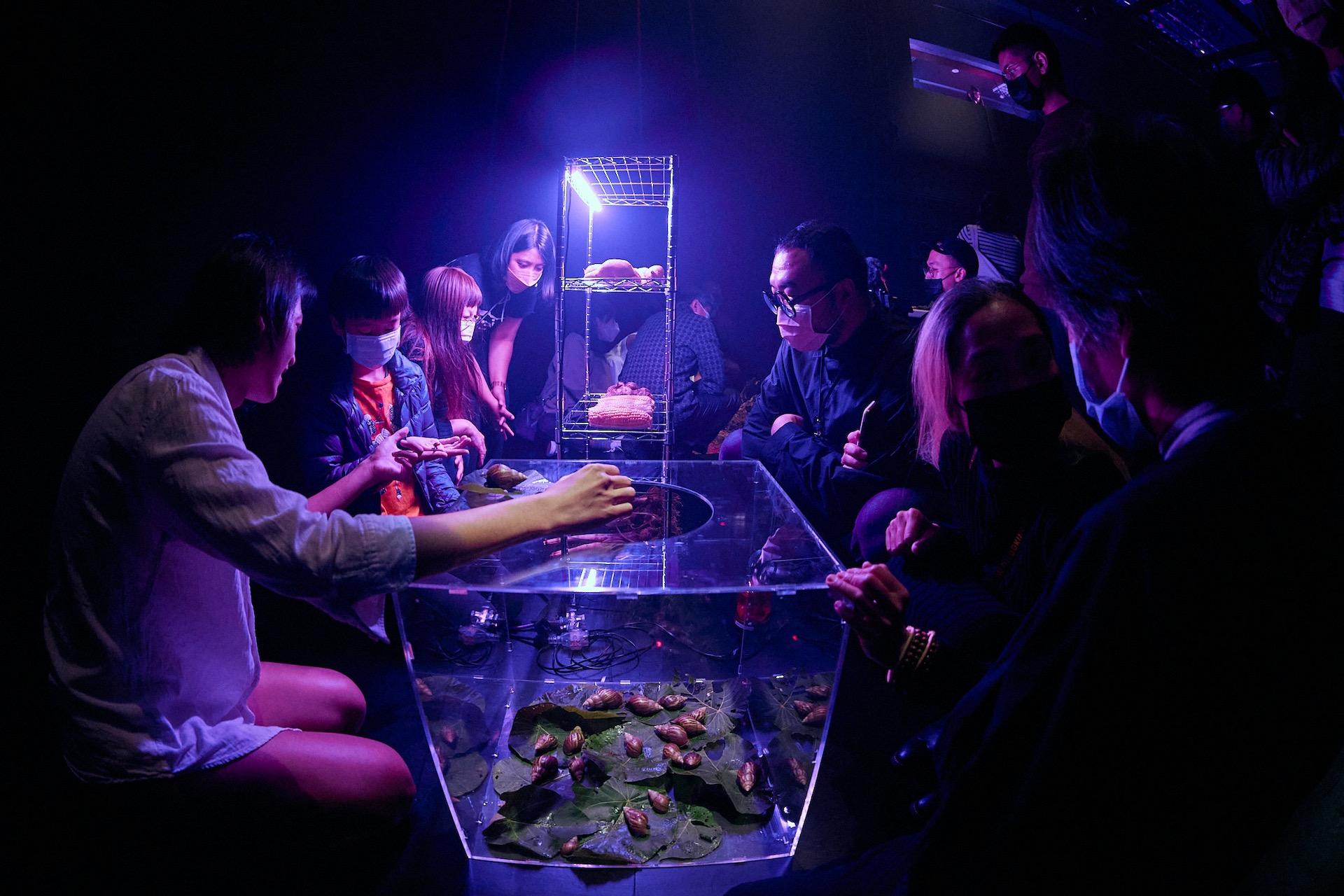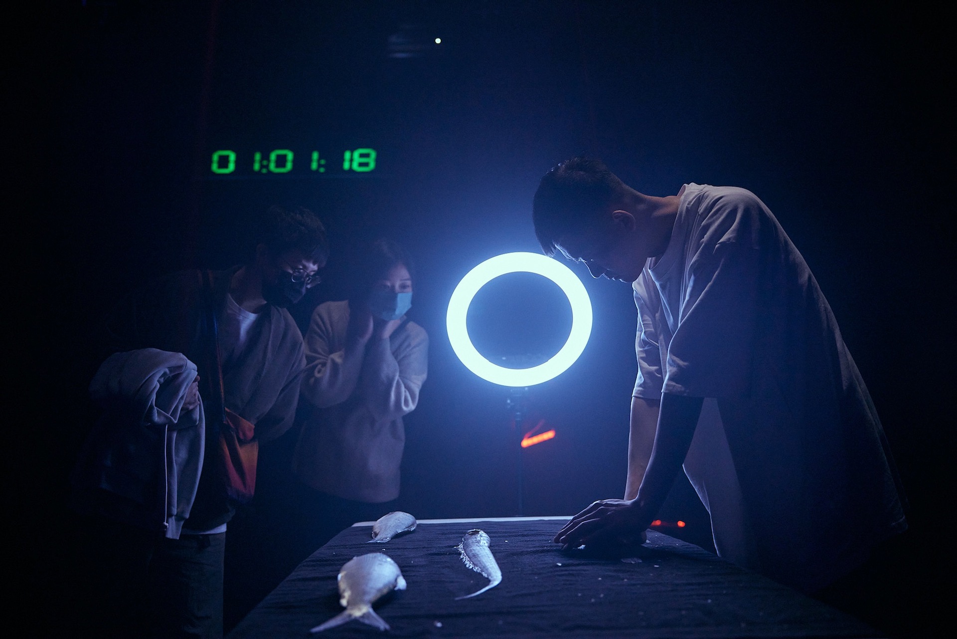 走入實驗劇場,黑暗與低限白光源營造的壓抑感,演出者們及物件擺放於黑盒子裡的不合時宜感,使人有一種古怪的不適。毫無遮蔽但又便於流動參觀的動線安排──甚至開放了觀眾上天頂的絲瓜棚,由上方俯瞰所有演出者及其他觀眾──一切彷彿創作者殷切的邀請參與者Tai Tai Tai,看吧看吧看吧,我們的生活從以前到現在,一直如此被觀看著。