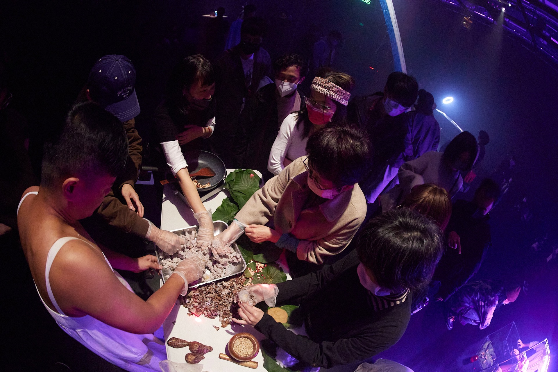面對我的困惑,借助酷兒之眼來看待演出者在演出中的行動,或許能得到一些線索。表演者Ising Suaiyung(以新.索伊勇),穿著一襲細肩帶,彎腰時會微露出乳溝的白色長禮服,手裡不停操持著各種家務,削芋頭、蒸芋頭和揉芋頭,最後變出一道料理。但在與觀眾的互動中,被熟識的觀眾喚作「ina」(媽媽、阿姨)的他,嗓音與動作又透露出男性氣息。原先傳統的性別分野──無論此傳統指的是漢人社群或原住民社群的異性戀思惟──藉著Ising展演生活面貌裡的操演,都令分野的界線因而浮動且模糊。