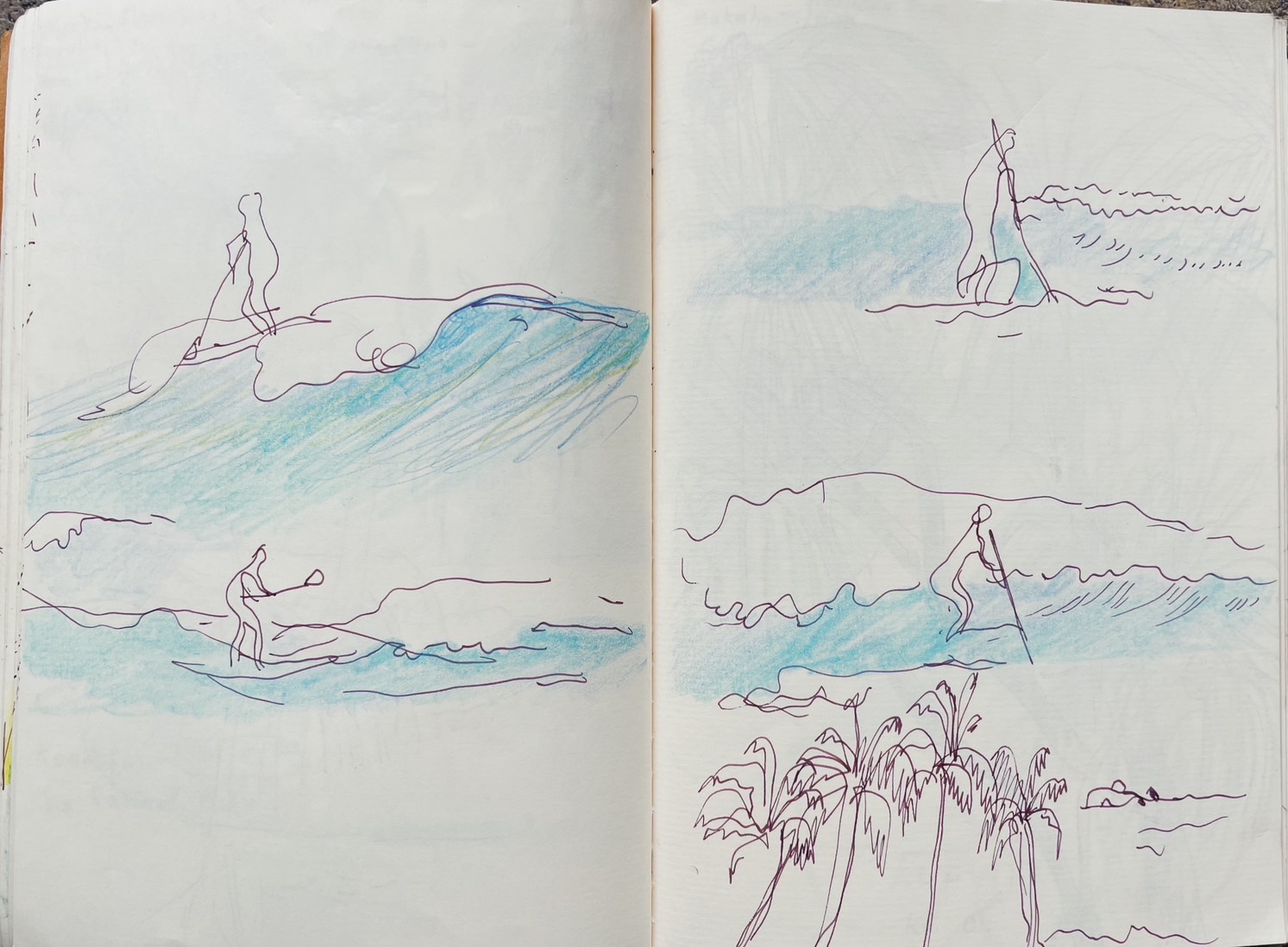 這些發展中的藝術價值觀裡,遠洋遷徙的南島海洋文化網絡是近期備受人類學與文化界關注的範疇之一,在藝術界則有藝術家拉飛・邵馬作為關鍵的「造舟者」。在「重航海洋的文化行動」篇中,我們也特別訪問了相關的創作與研究者,試圖呈現當代海洋文化行動的圖景切片,並以藝術家葉海地參與「南島‧台東隊」過程中所創作的寫生,作為本次專題的主視覺。