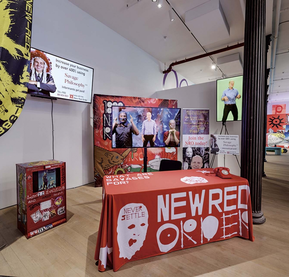 一走進展場,幾個讓人有點不知所措卻心生嚮往的廣告,好像勾起了心中的罪惡愉悅,在都市的另一方,有著未知神秘、待人探索、似乎能逃離四處充滿危機的現代生活的解決方案,只要學習另外一種生活方式我們的未來會更美好!「新紅秩序」(New Red Order)的成員亞當.哈利爾(Adam Khalil)、查克.哈利爾(Zack Khalil,歐及布威族〔Ojibway〕)、傑克遜.波利斯 (Jackson Polys,特林吉特族(Tlingit)自稱「新紅秩序」是一個公眾服務組織,並戲稱自己是報導人〔informat〕),回應著,原民藝術家參與殖民者的藝術世界裡,總是被要求提供自己族群文化的相關知識。這種關係像是歷史上報導人與人類學家權力關係的延伸,他們試圖將這樣不均衡的關係複雜化,因此他們「化身」為報導人,作為某種原民性的「代理人」,思考在美國不論是政治版圖、迷思想像、美國夢裡,原民性是如何被深切地渴望,被需要,以及被詮釋。除了成為被田野的對象,「新紅秩序」也試圖反過來探索、測量殖民者的慾望,試圖為這種鋪天蓋地而來的原民性渴望提供「仲介」與「服務」,藉以袒露生活中微妙尷尬的、難以清楚說明的殖民處境。