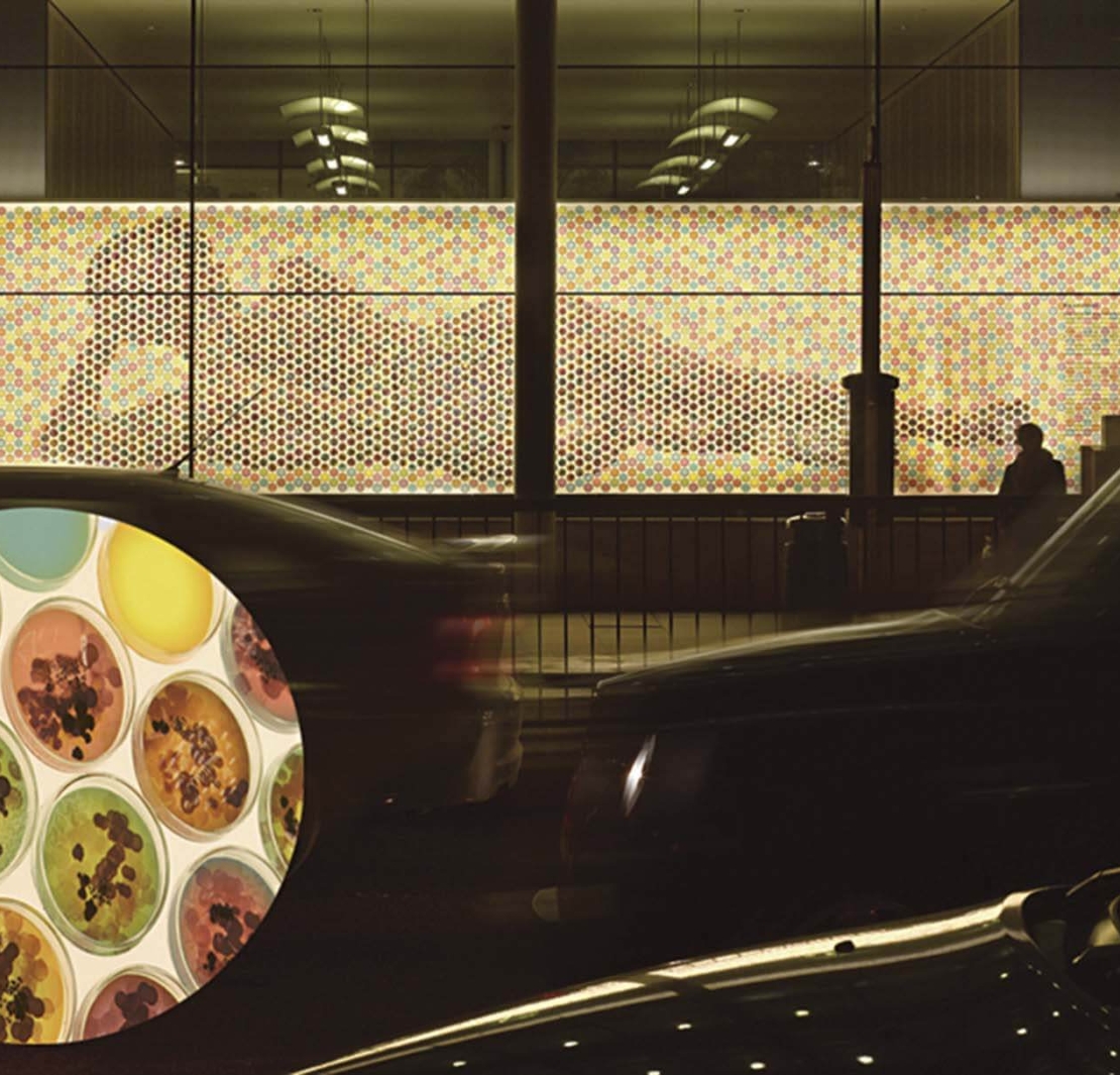 沿著「身體即是生態系,個體即是群像」的視角,來看藝術家茱莉雅.洛曼(Julia Lohmann)的作品《共存》(Co-Existence),或許我們可以說這個以9,000個帶有細菌菌落的培養皿所構成的人體側身,不僅是一個巨集的培養皿裝置,更是一個以微生物堆砌的人體塑像。洛曼受棲息在我們身體那些肉眼看不見的微生物宇宙啟發,藝術家以最常見的身體菌落物種為基底進行培養與堆砌。每一個微生物的培養皿的位置則顯示了其最常棲居的身體部位。作品《共存》立體化了身體菌落的分佈也立體化了身體作為一個生態系的真實。