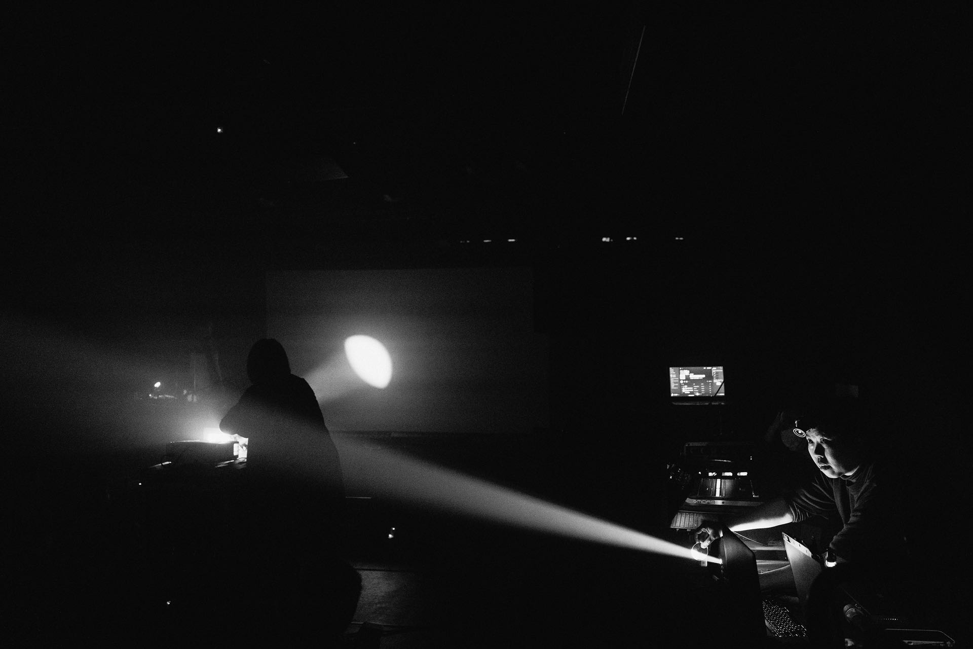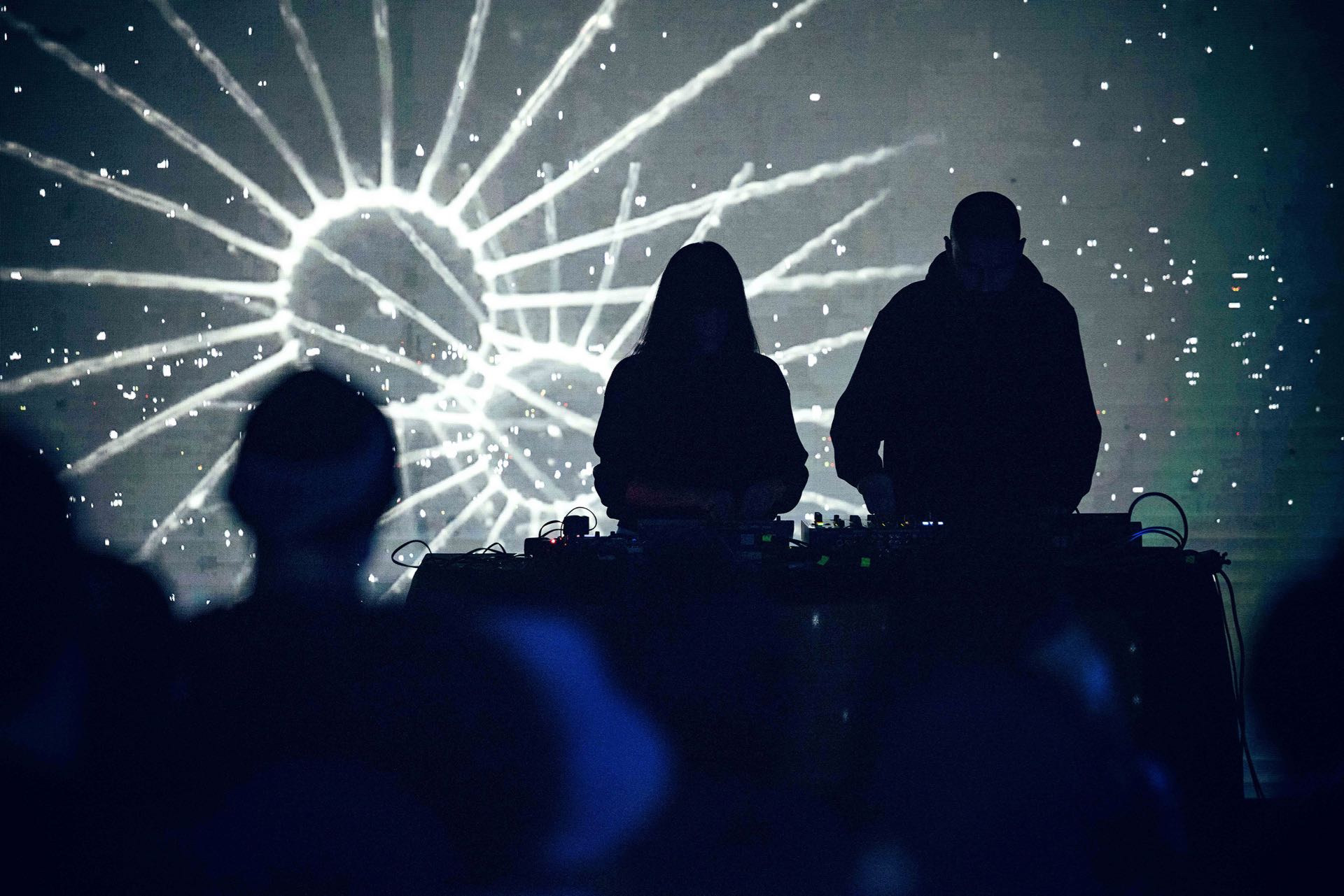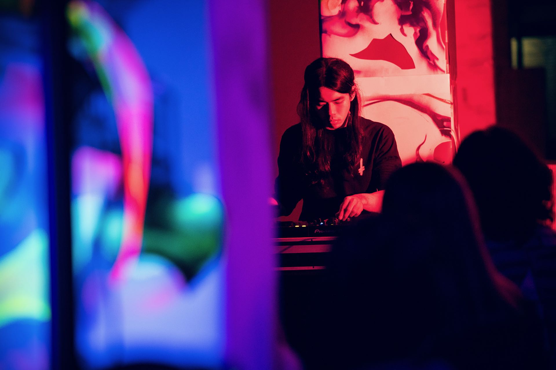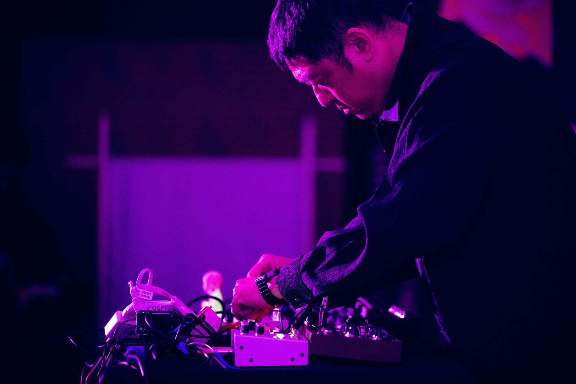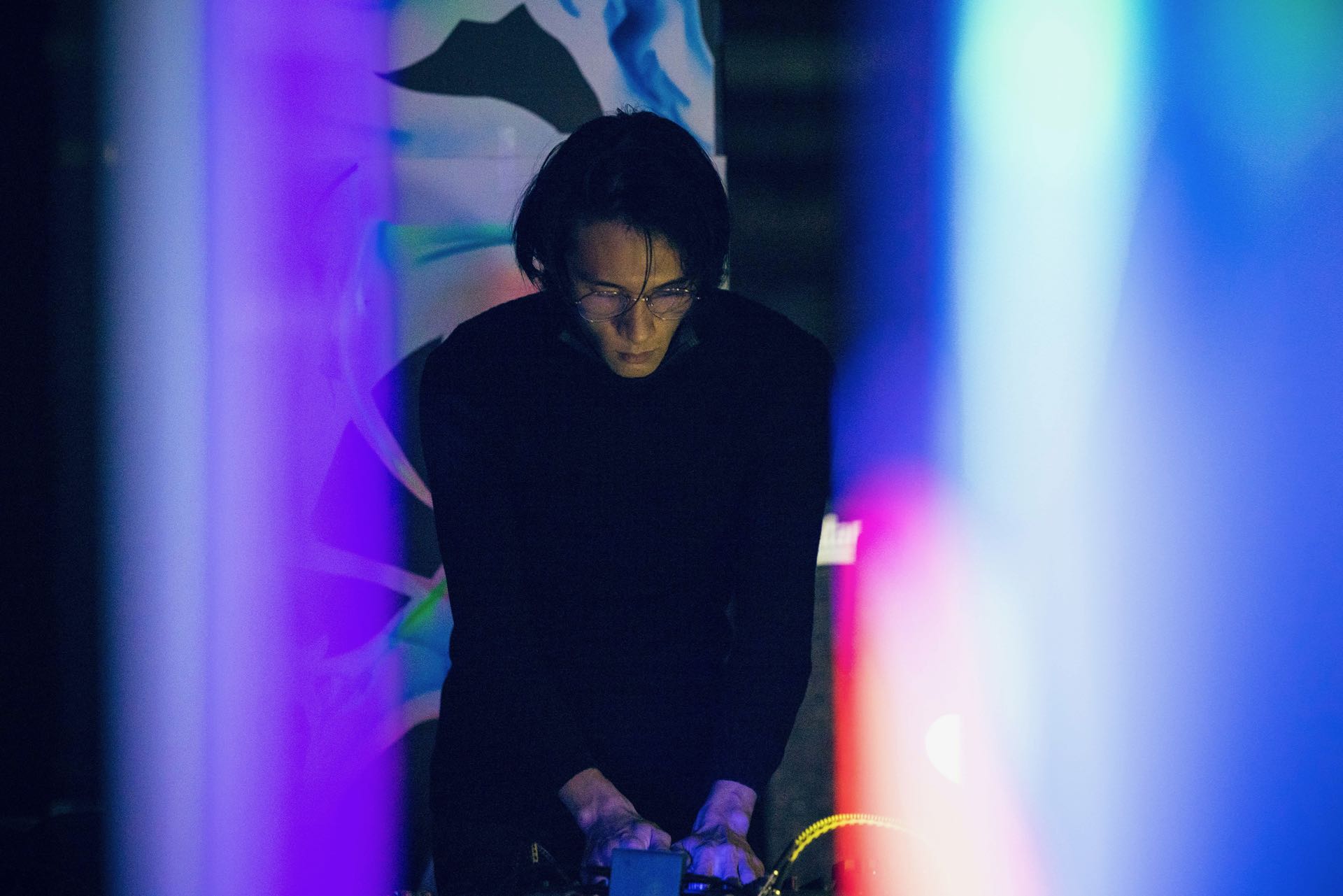 爆裂窒息的轟炸後,日本的DJ Sniff則是以滑溜的八爪章魚姿態出場,極簡又物質性地操作數位唱盤與刷碟噪音,瘋狂手速與唱盤融合成一具名副其實的賽博格「怪物」。他不只是再現音樂,而是凸顯「聲音的物質媒介」。經歷哈桑像巨熊壓頂的厚重窒息,DJ Sniff則是輕巧與彈性地悠遊在液態之海裡,中後段的高音波更讓人感到內省與抽象的模糊感受。