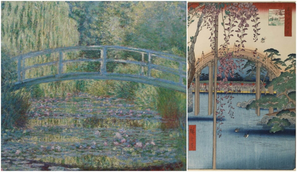 為此,畫家化身為辛勞的園丁,親自挑選適合種植的花卉,並從周邊的土地引進溪流,開闢池塘,栽種柳樹、紫藤與睡蓮(註1)。在吉維尼生活的數十年間,莫內創作了一系列以蓮池為題材的油畫,成為他日後留名傳世的代表作——可能是他除了《印象.日出》以外,最為人所知的作品之一。 藝術史研究者告訴我們,莫內的蓮池系列除了體現對大自然的觀察與畫面氣氛的掌握,還與畫家對日本美術的濃厚興趣有關。印象派的支援者,法國藝術記者杜雷(Théodore Duret, 1838–1927)曾盛讚,莫內是「第一個在色彩的運用上,像日本人一樣大膽的人。」杜雷是一位日本美術的愛好者與收藏家,他和莫內都共享著對葛飾北齋、歌川廣重的推崇。莫內在信中也曾提到:「在西方的我們,尤其欣賞他們(指日本人)確立主題的大膽嘗試,這些人教會我們以不同的方式創作。」(註2)