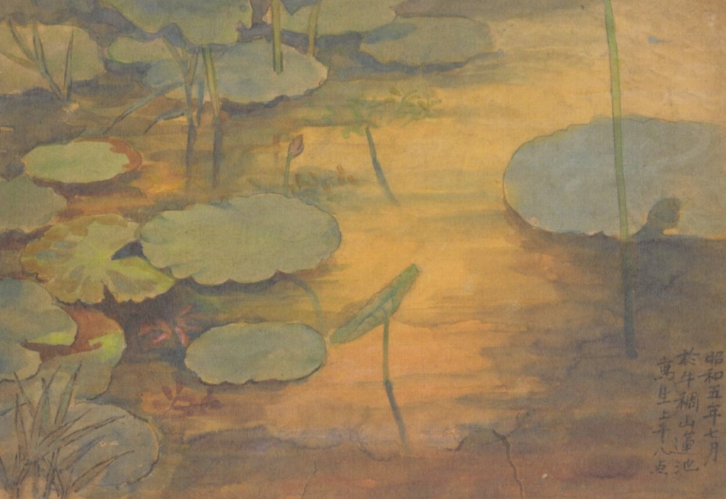 這種對時間、光線細微變化的追求態度,以及反覆的身體勞動,也出現在同時代的台灣畫家林玉山(1907–2004)身上。1926年,就在莫內逝世的那年,20歲的林玉山在師友的鼓勵下前往東京習畫,四年後他完成了《蓮池》,成為他早期生涯的代表作。