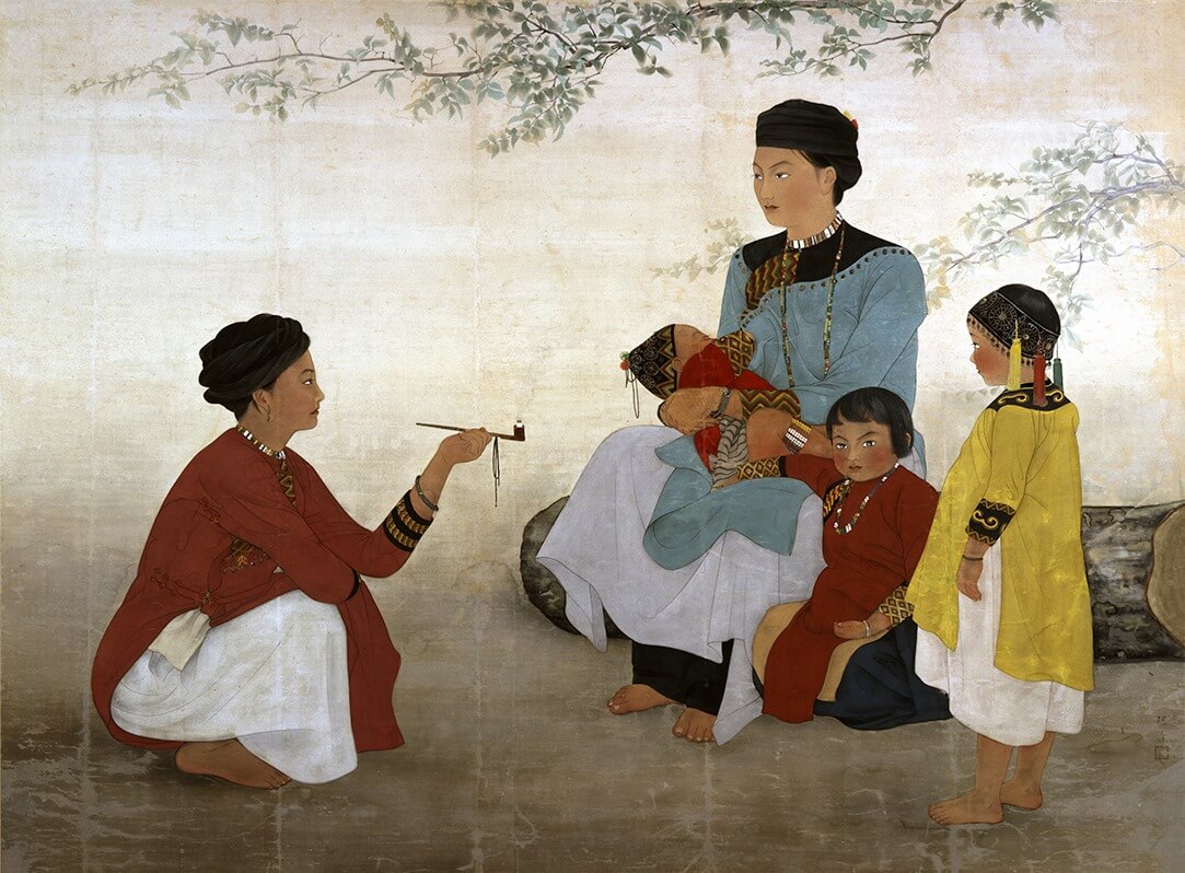 若說日本最有名的母子圖像,應是訶梨帝母(鬼子母神)。日本京都醍醐寺收藏的訶梨帝母像,描繪一名孩童趴在訶梨帝母腳邊,另一名則在女神懷中,體現訶梨帝母作為孩童守護神的典故。雖說陳進《三地門社之女》畫中婦女膝蓋旁也有一名孩童,但卻不是趴附在婦女的身上,而是類似陪伴與守望的形象,顯然並非出自訶梨帝母的圖像。