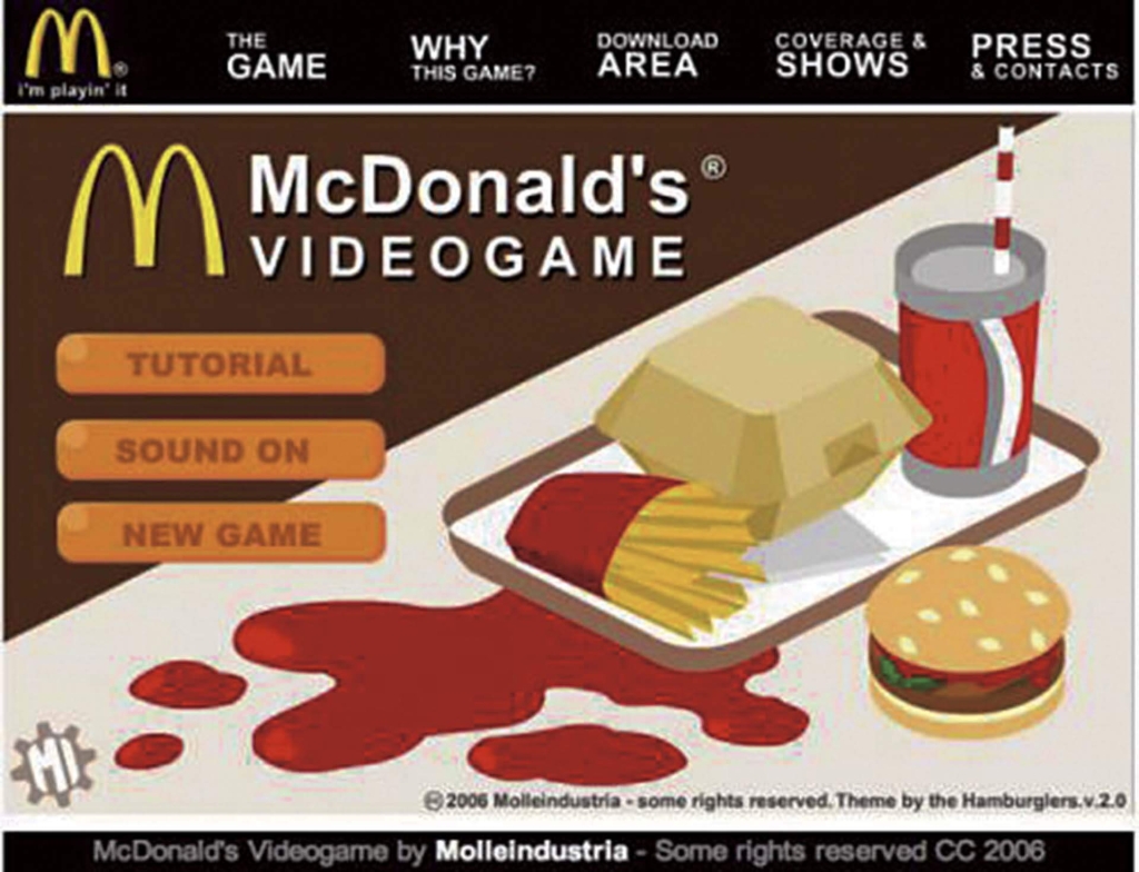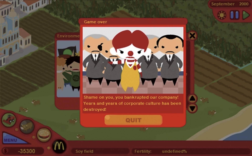 在著名的《開家麥當勞》(McDonald’s Video Game)中,玩家會看到這樣反諷的廣告式的介紹:「在像麥當勞這樣的公司賺錢可不容易!在每一個漢堡背後,都隱藏著您需要掌握的複雜流程:從牧場到屠宰場,從餐廳到品牌建設。您將發現所有讓麥當勞成為世界上最大公司之一的─『潛規則』。」設計師以牧場、屠宰場、餐廳和公司辦公室四個子系統入手,讓玩家扮演麥當勞的CEO,在每個場景做出決策,交織體驗這些「潛規則」到底是什麼,又如何運作。例如:在牧場場景中,玩家需要選擇是否砍伐熱帶雨林、得到放牧的土地。每個決定都可以幫助玩家提升生產效率、增加盈利空間、降低生產成本或取消反對者的聲音,但也可以導致環境污染、傳播疾病與剝削員工。在這些子系統的操控之外,遊戲本身延續了商業社會最根深蒂固的規則:如何將利益最大化─哪怕這種最大化是建基於對人權、社會和自然的嚴重迫害之上。