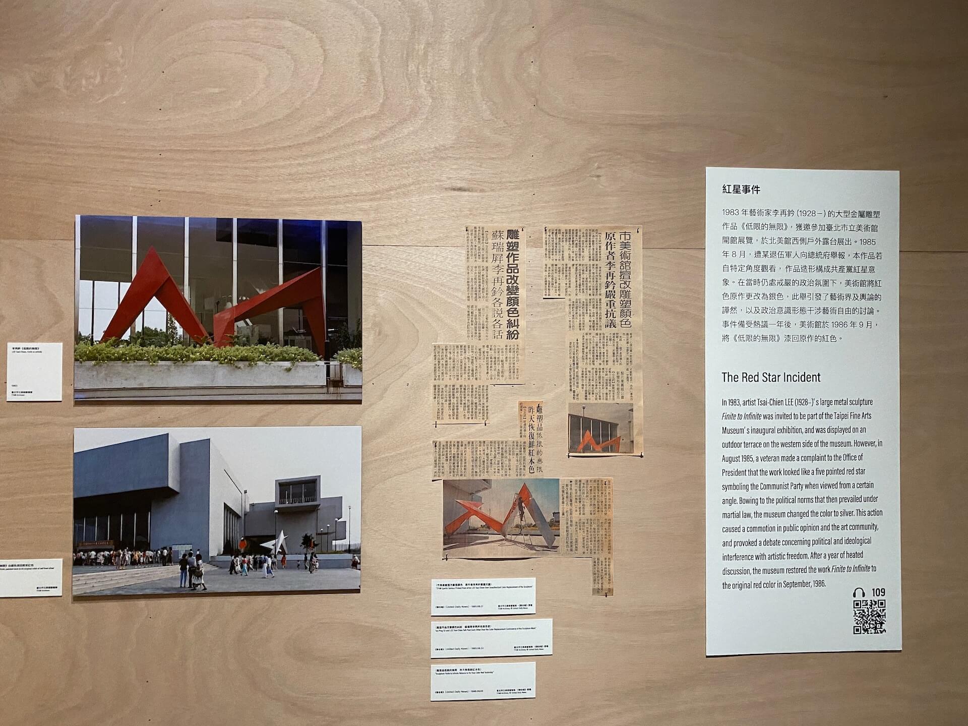 「狂八〇」展覽裡再次詮釋起1985年藝術家李再鈐為北美館開館委託,而設置在館外廣場的雕塑作品《低限的無限》,經過兩次檢舉而被館方擅自從紅色改為銀色的「五芒紅星」去政治化聯想的事件。這說明了,李再鈐抗議創作自由受政治干預壓迫是一介「反對美學政治化」的現代主義造形運動主體行為,但展覽的前半段為納入了整體民主「熔爐式」的演繹,卻反轉成為了「政治美學化」也說得通的觀感。